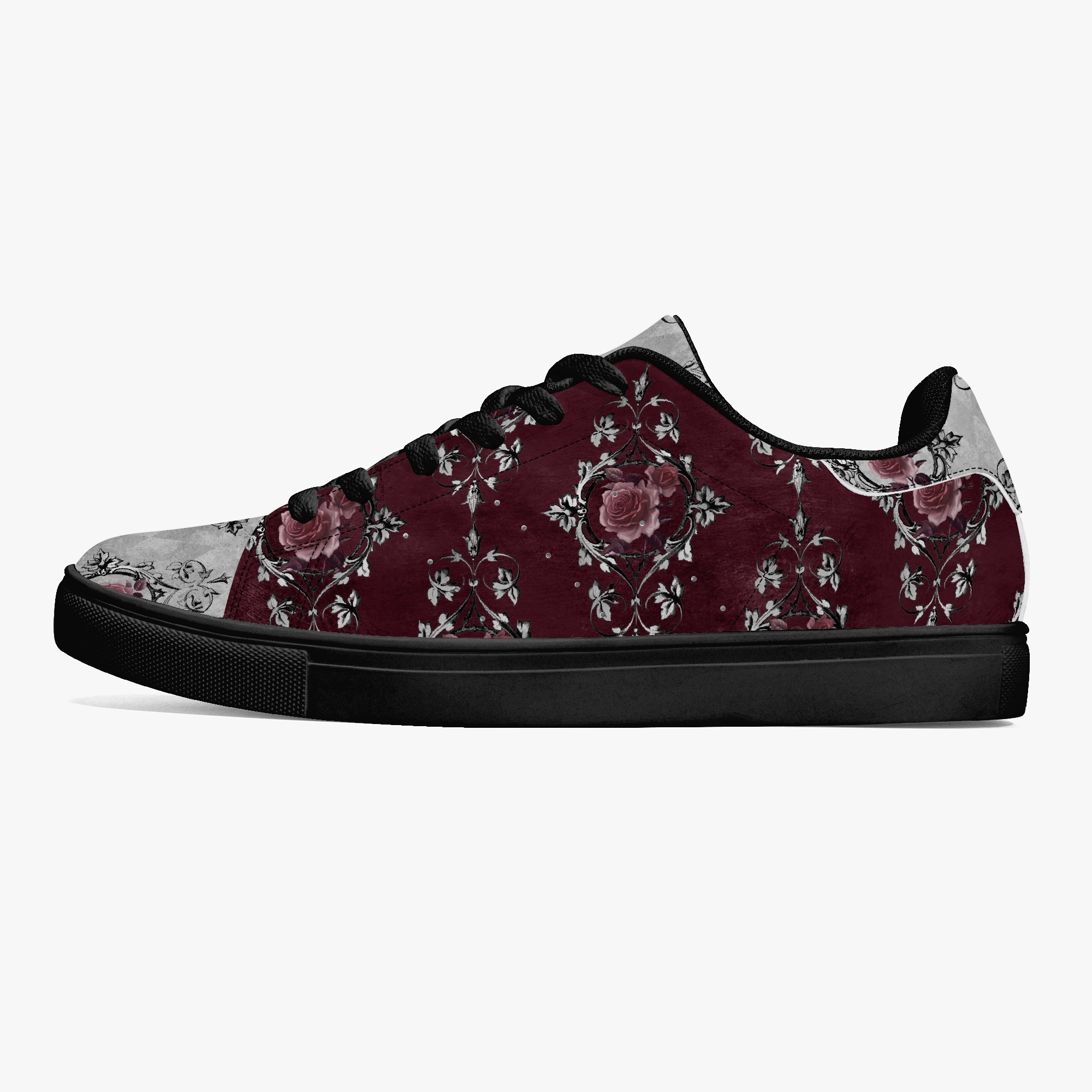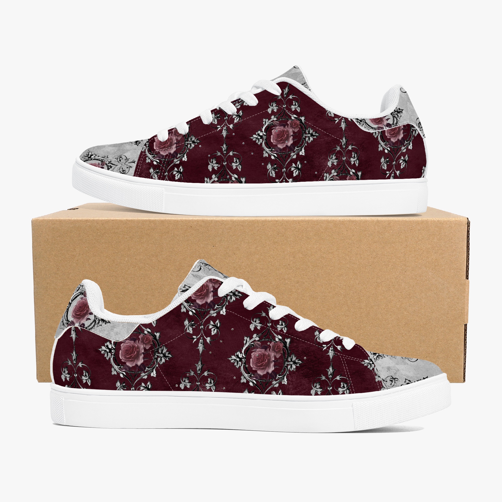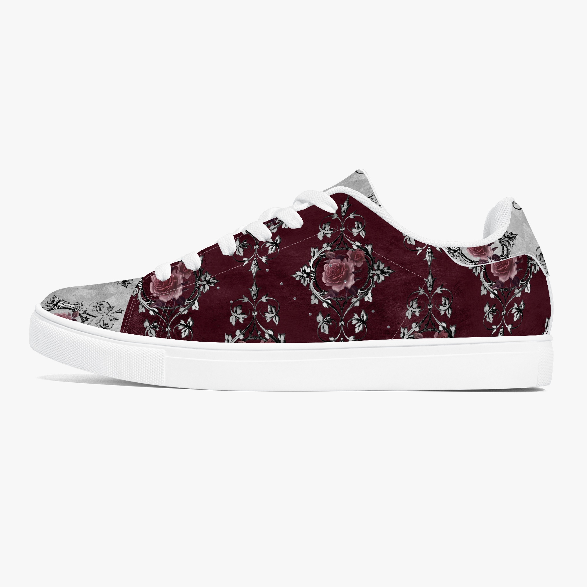 Stressed Burgundy & Rose Collection – Low-Top Leather Sneakers Burgundy with Pink Rose Damask