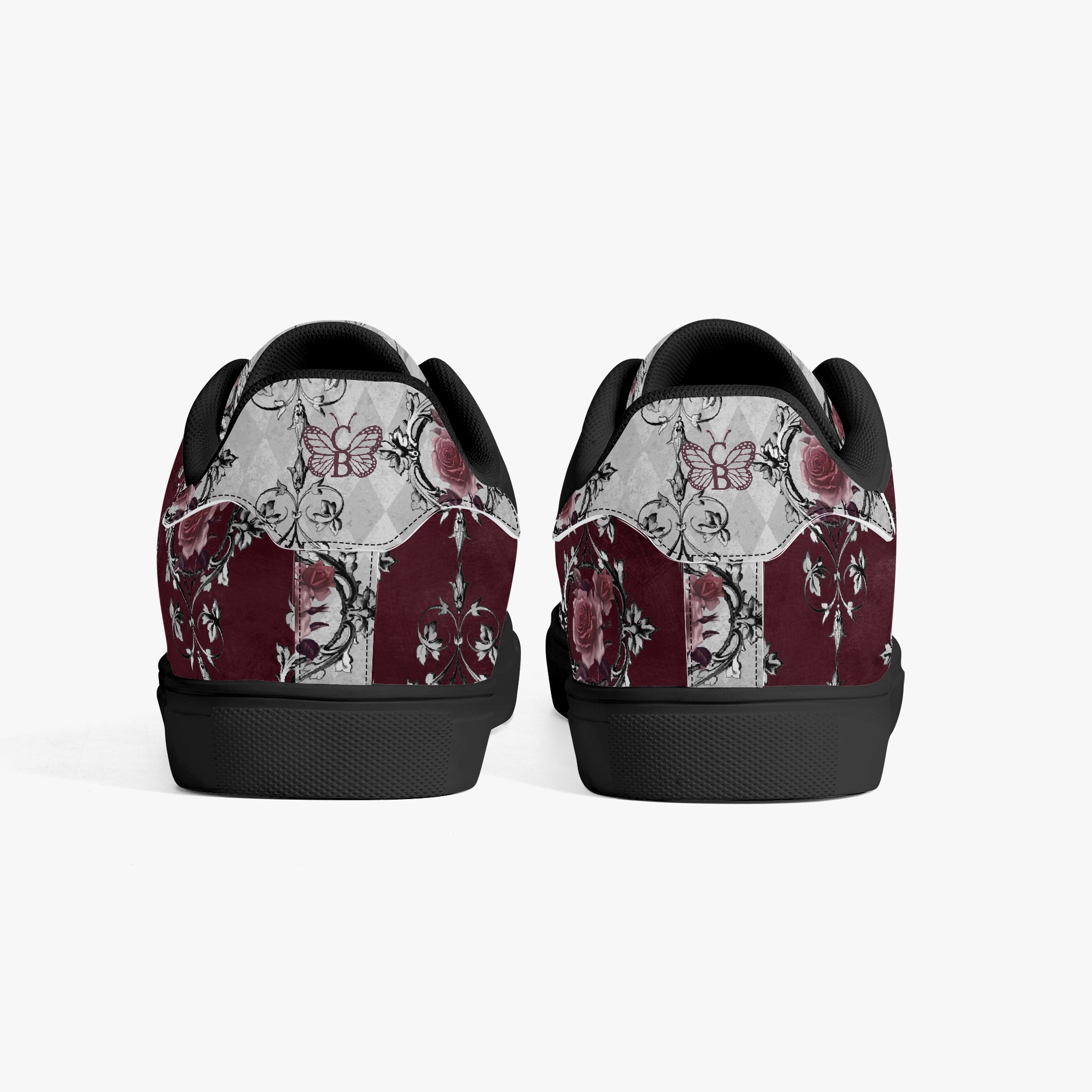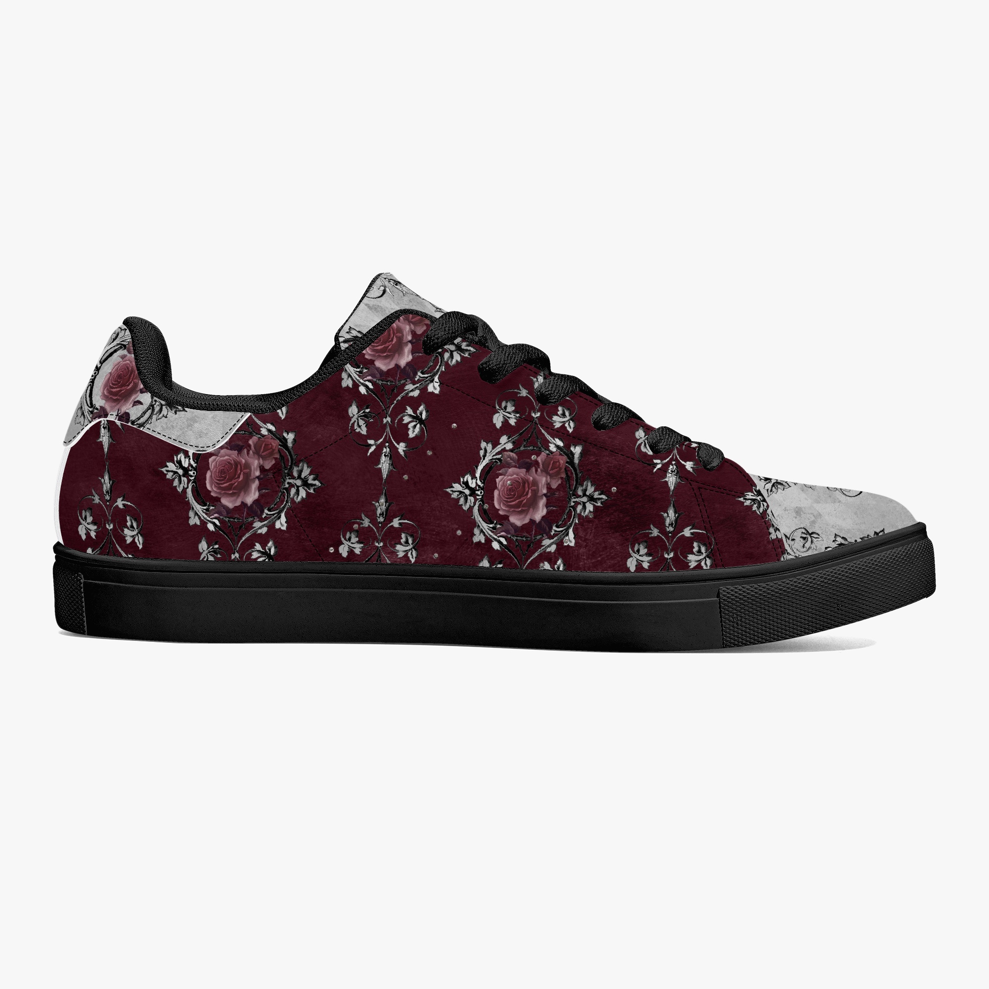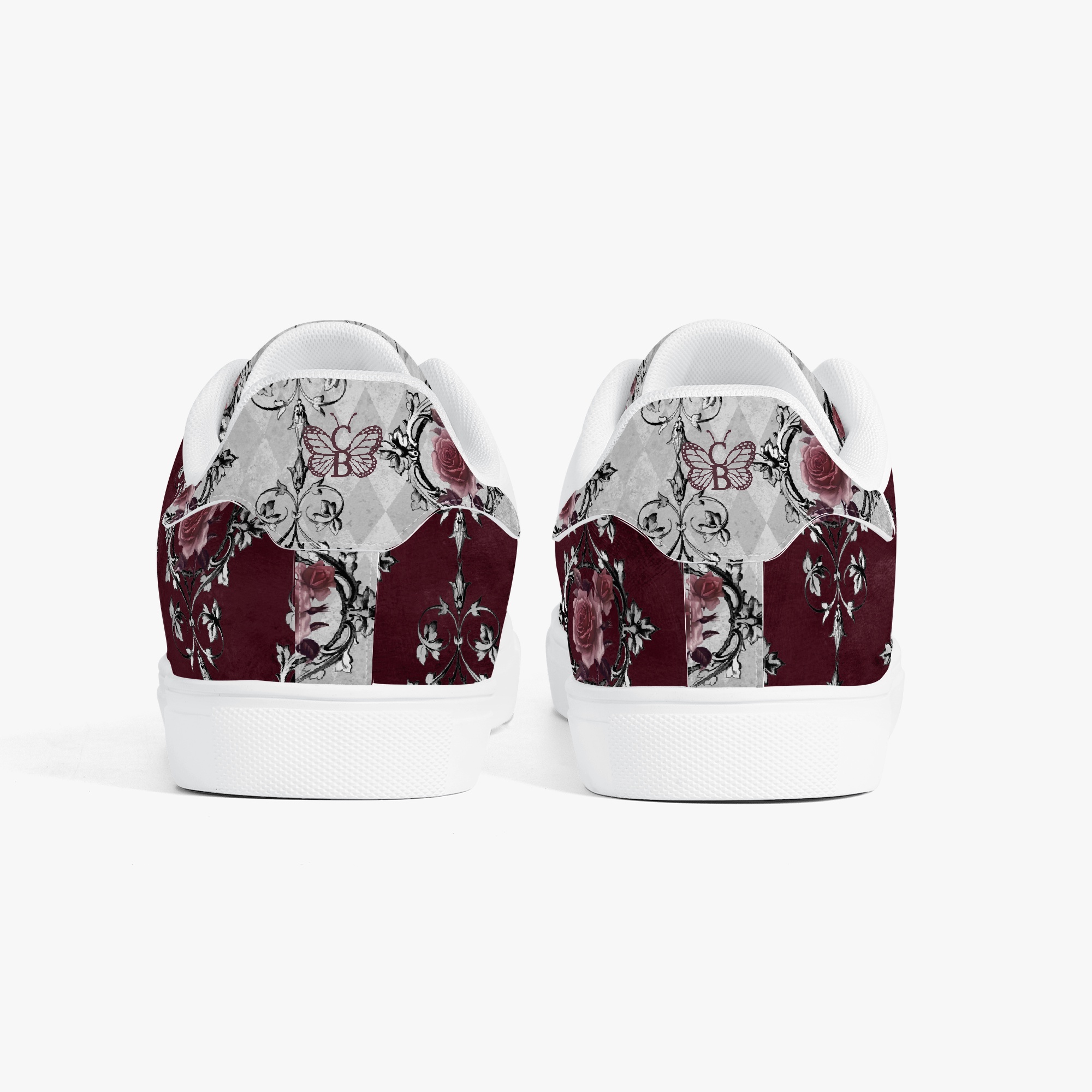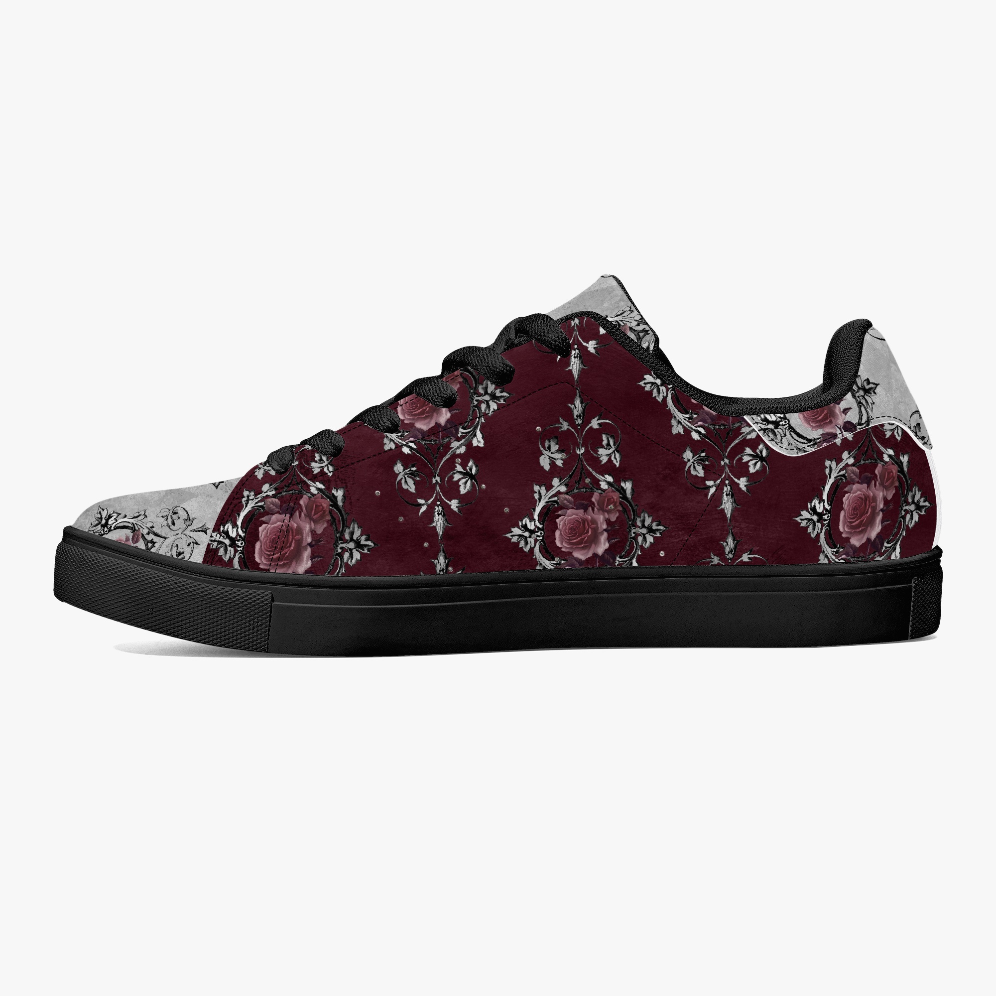 Stressed Burgundy & Rose Collection – Low-Top Leather Sneakers Burgundy with Pink Rose Damask
