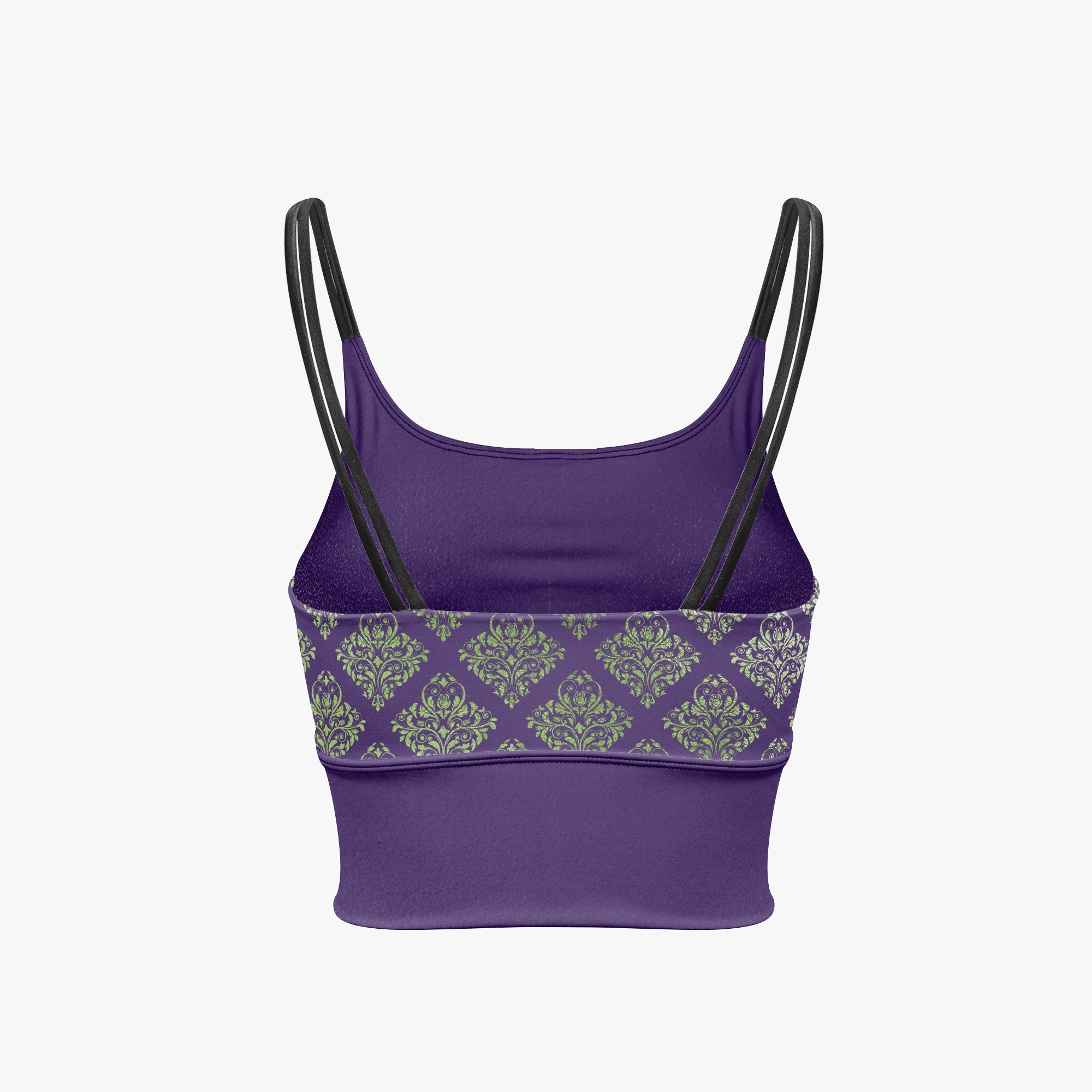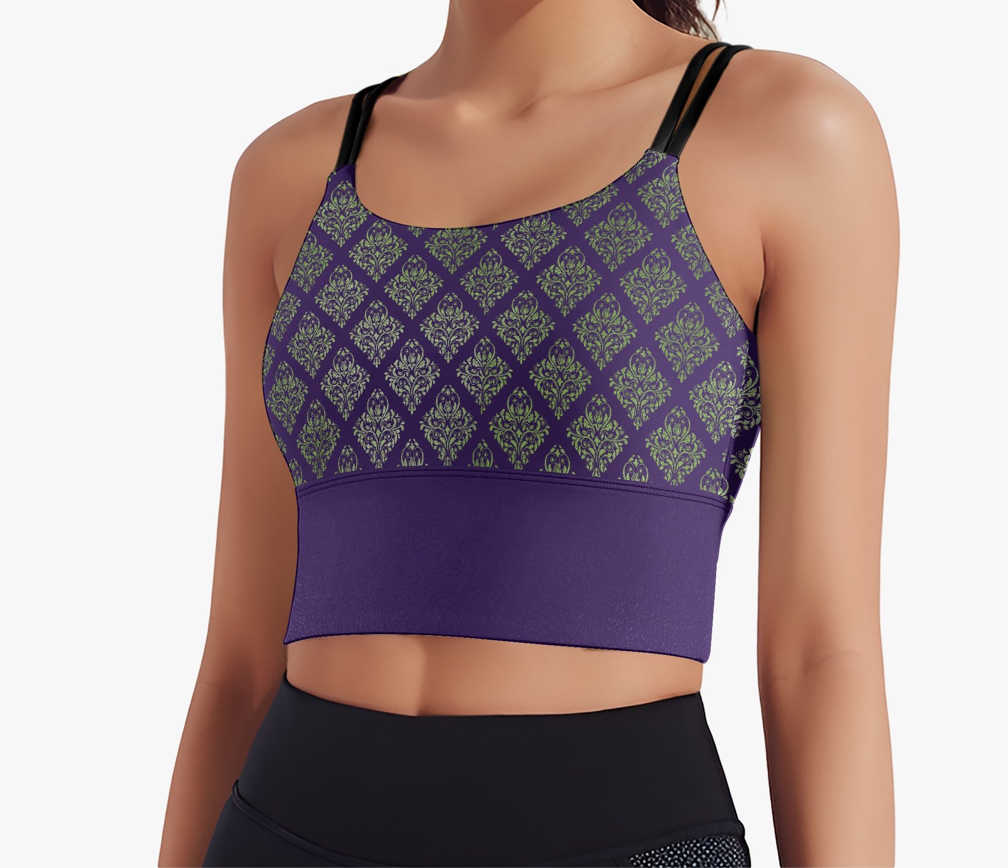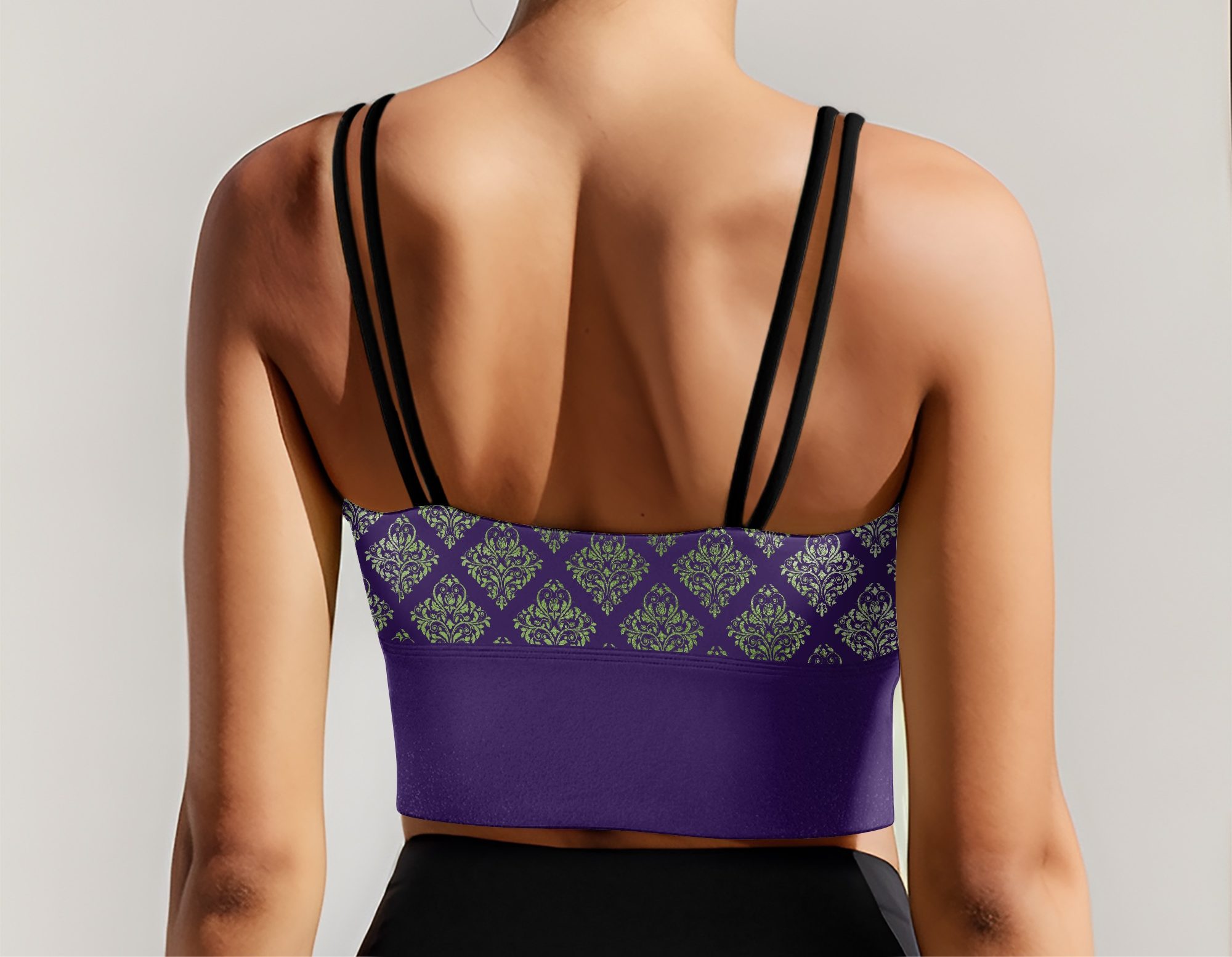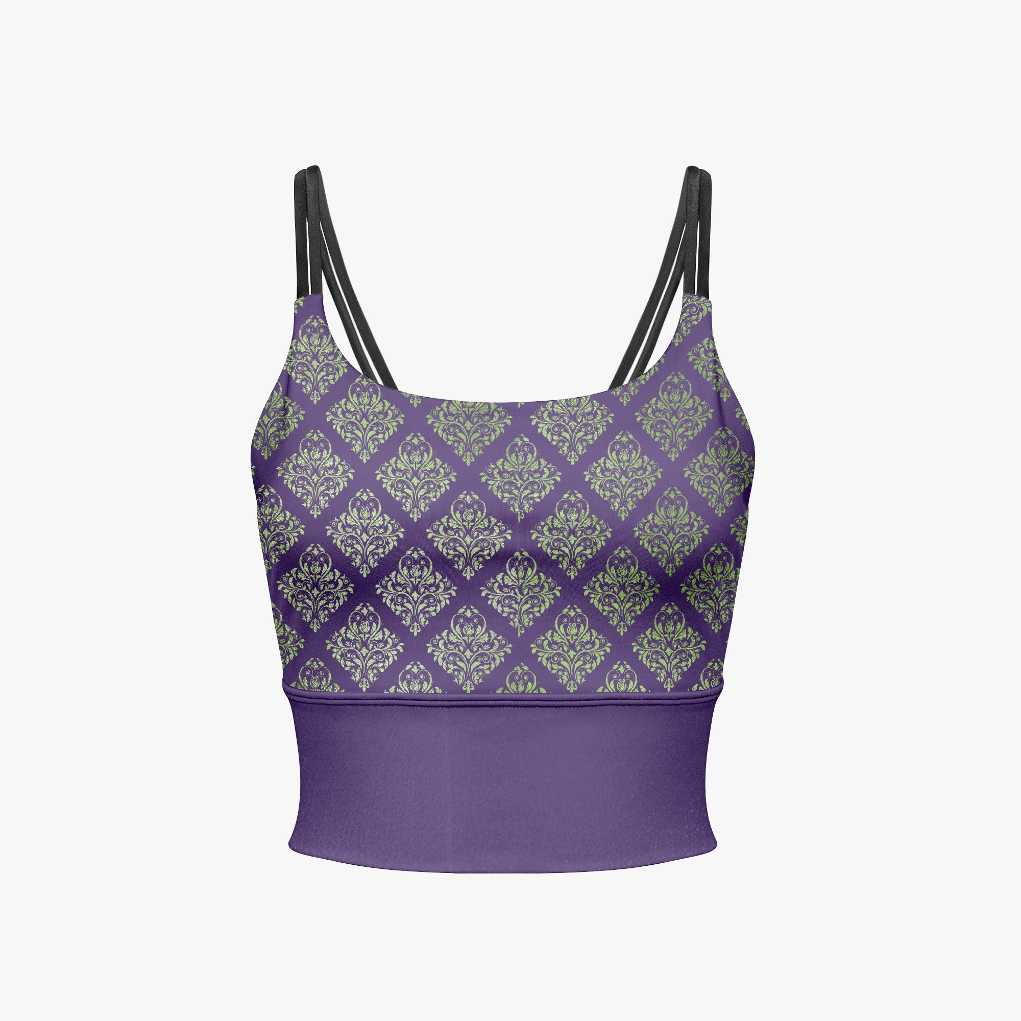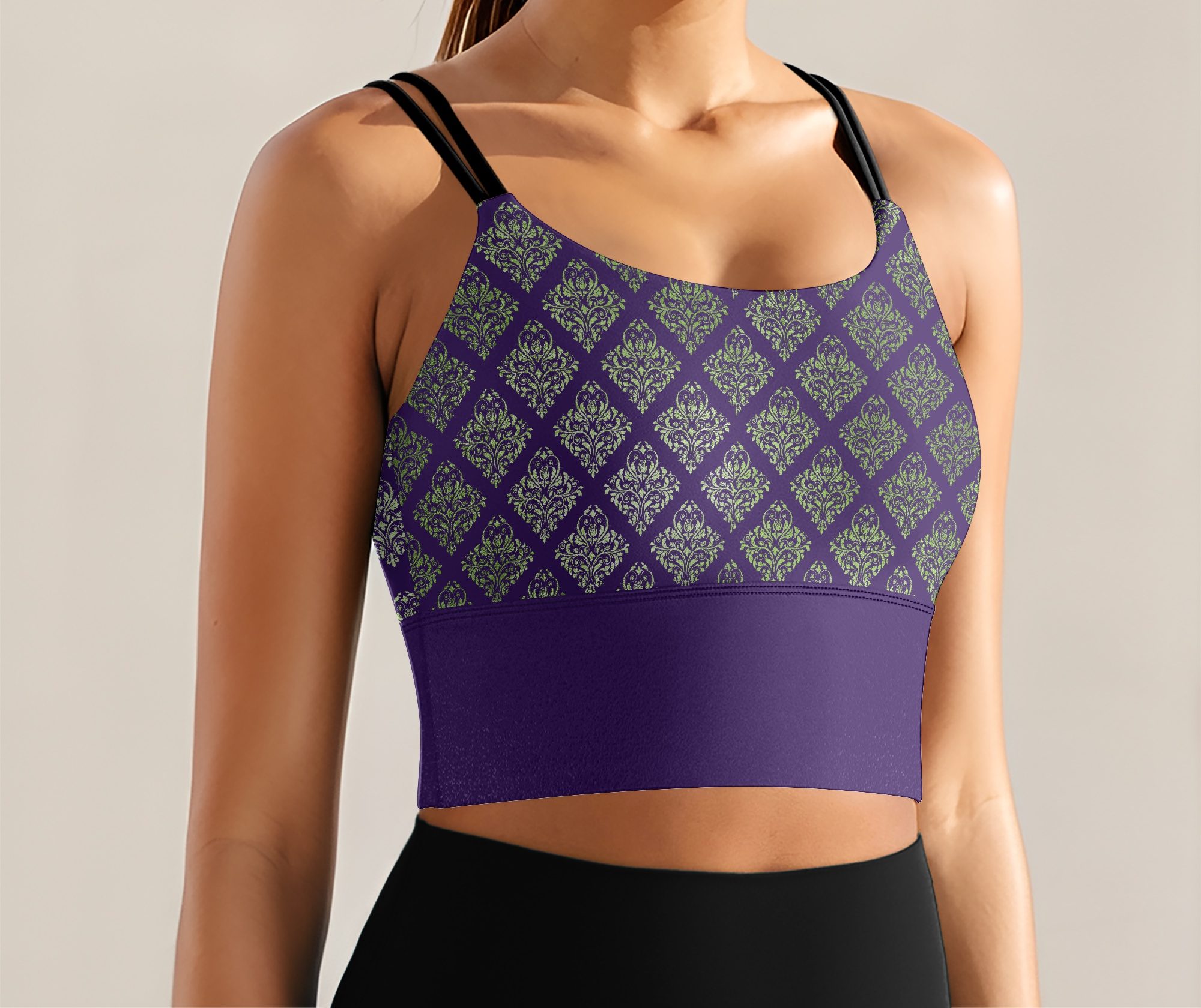 Indigo Viridescent Collection – Short Yoga Top Deep Indigo and Sage Damask