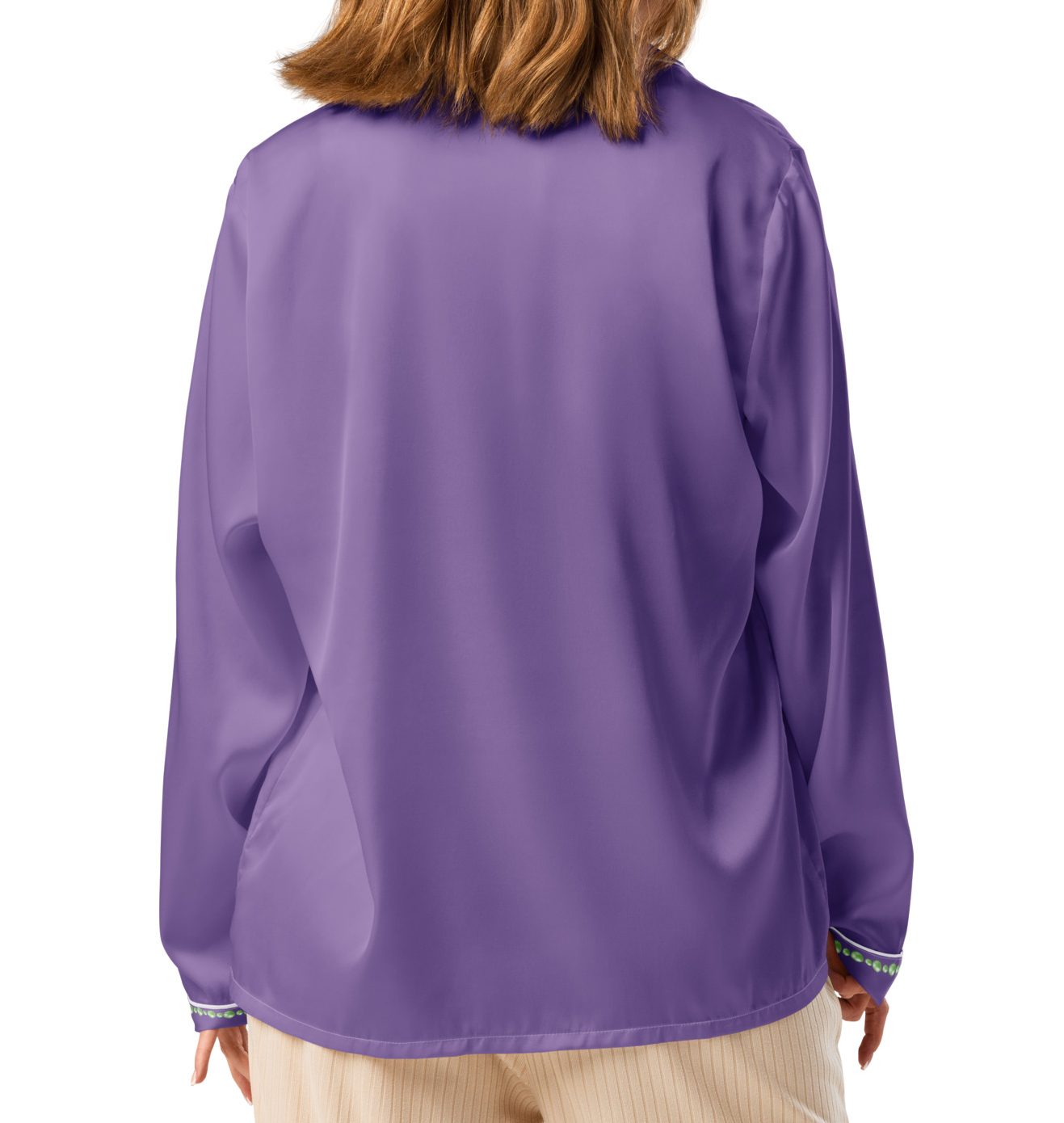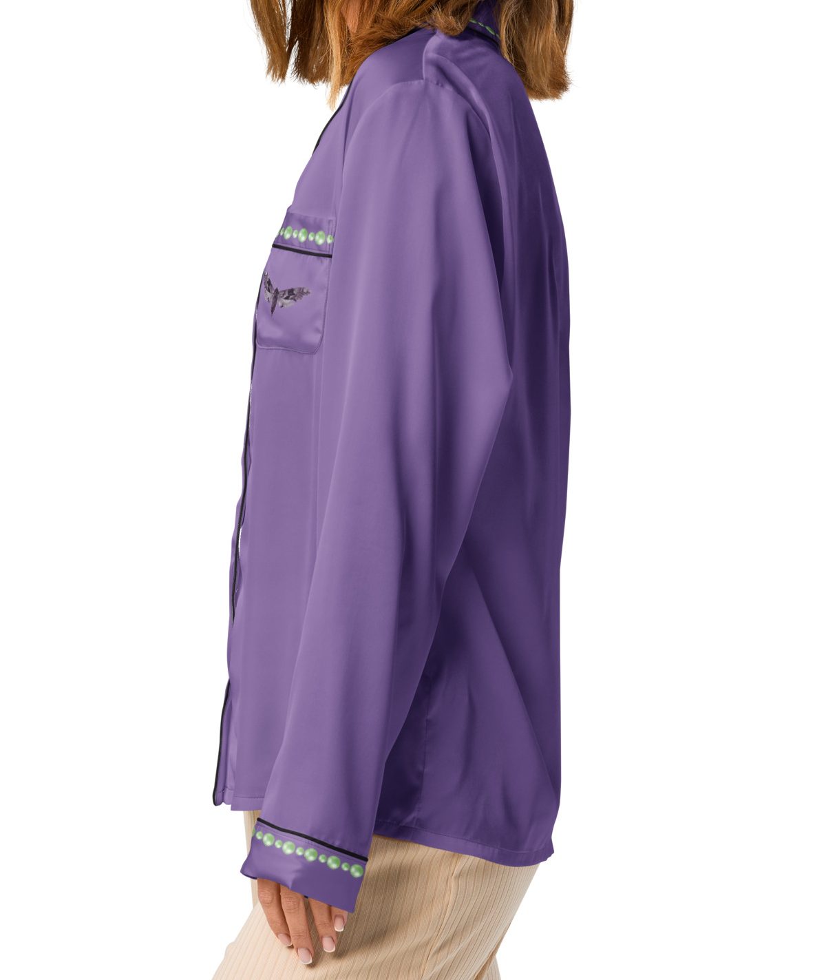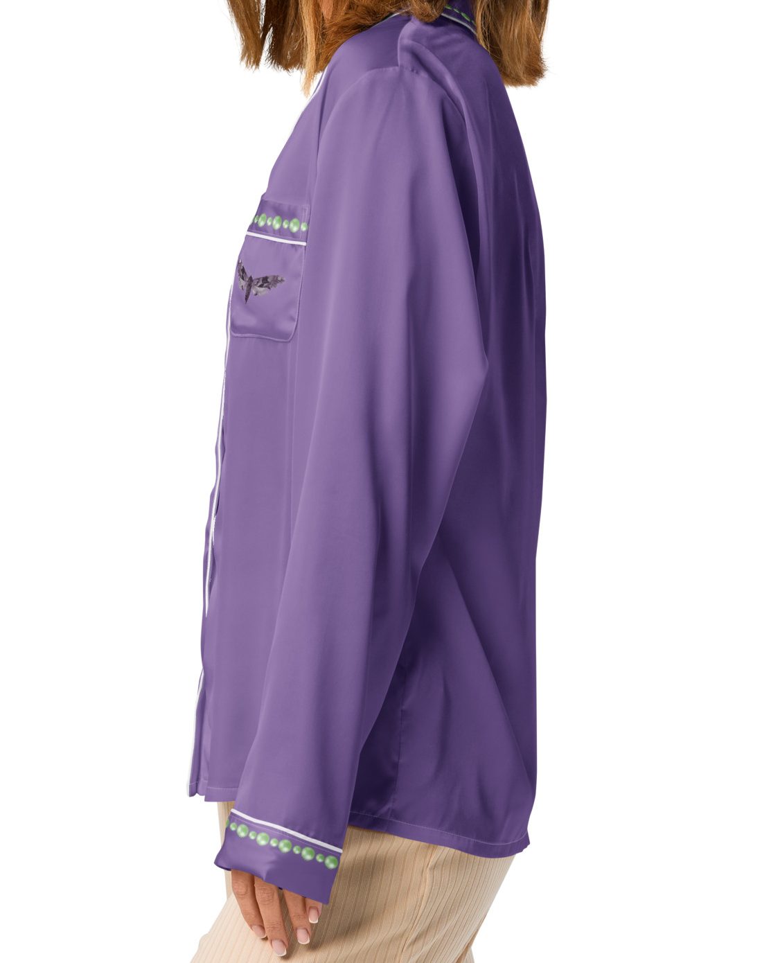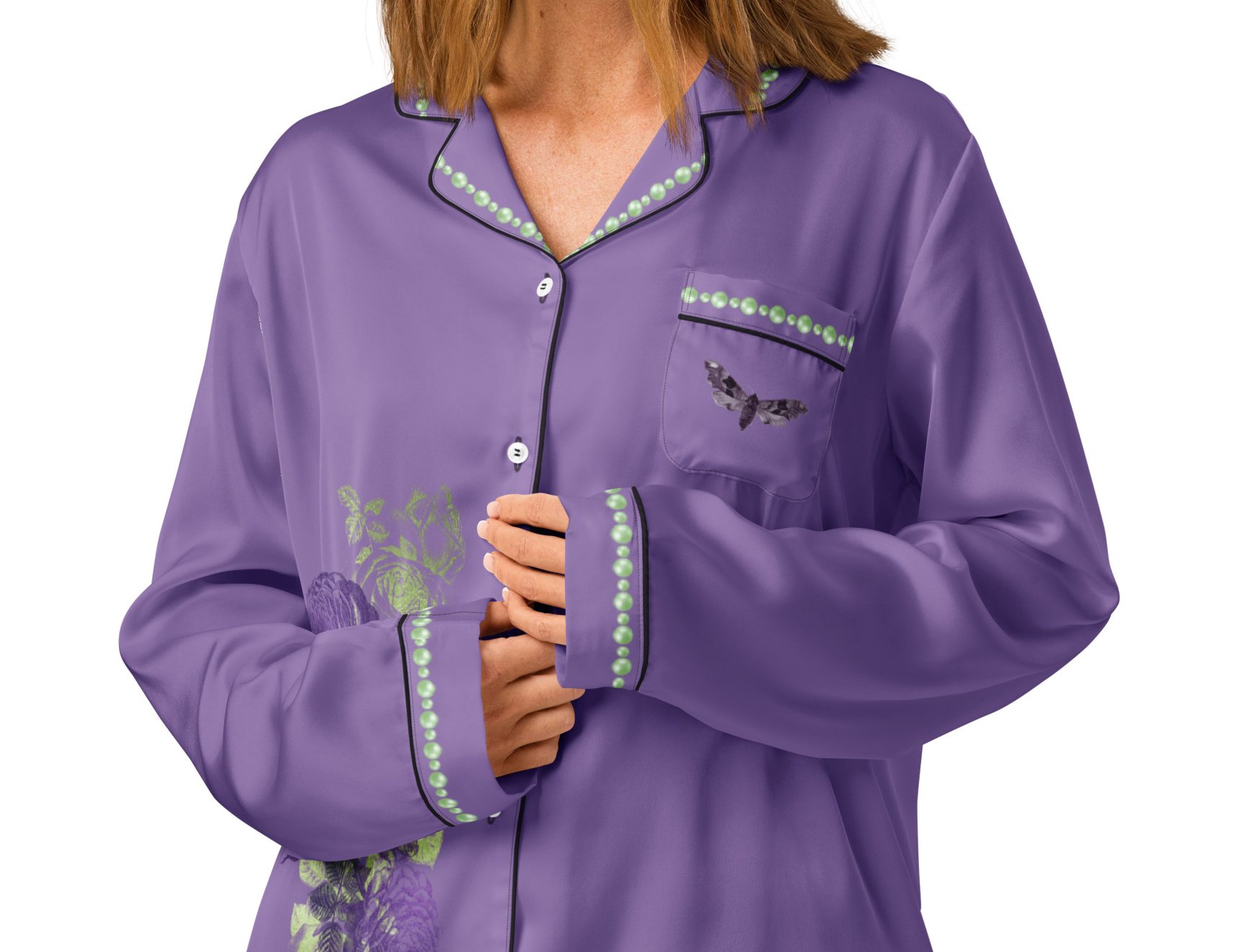 This silky pajama top is ideal for a cozy day when you want to feel both comfortable and elegant. It features a relaxed fit, chest pocket, and elegant piping detail.