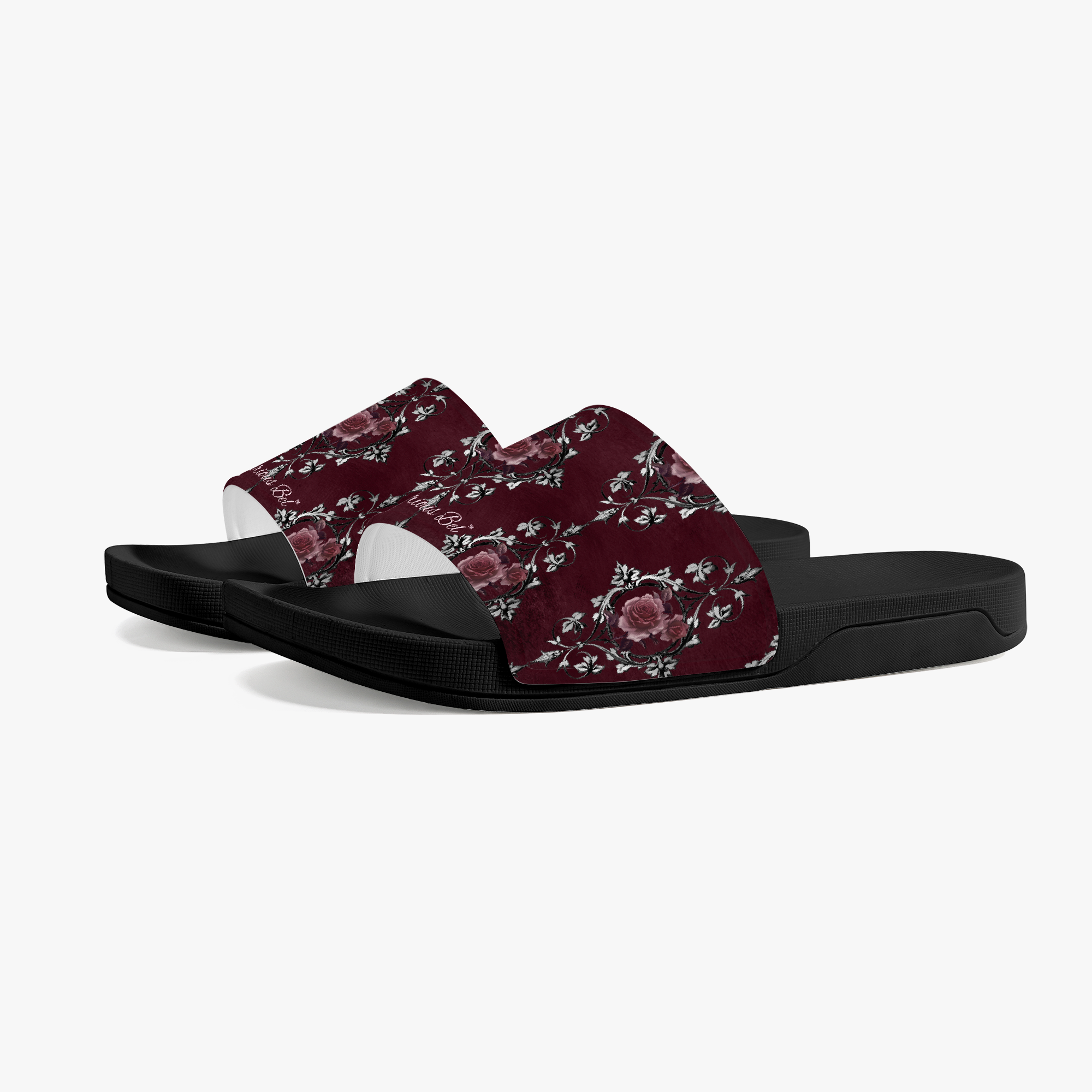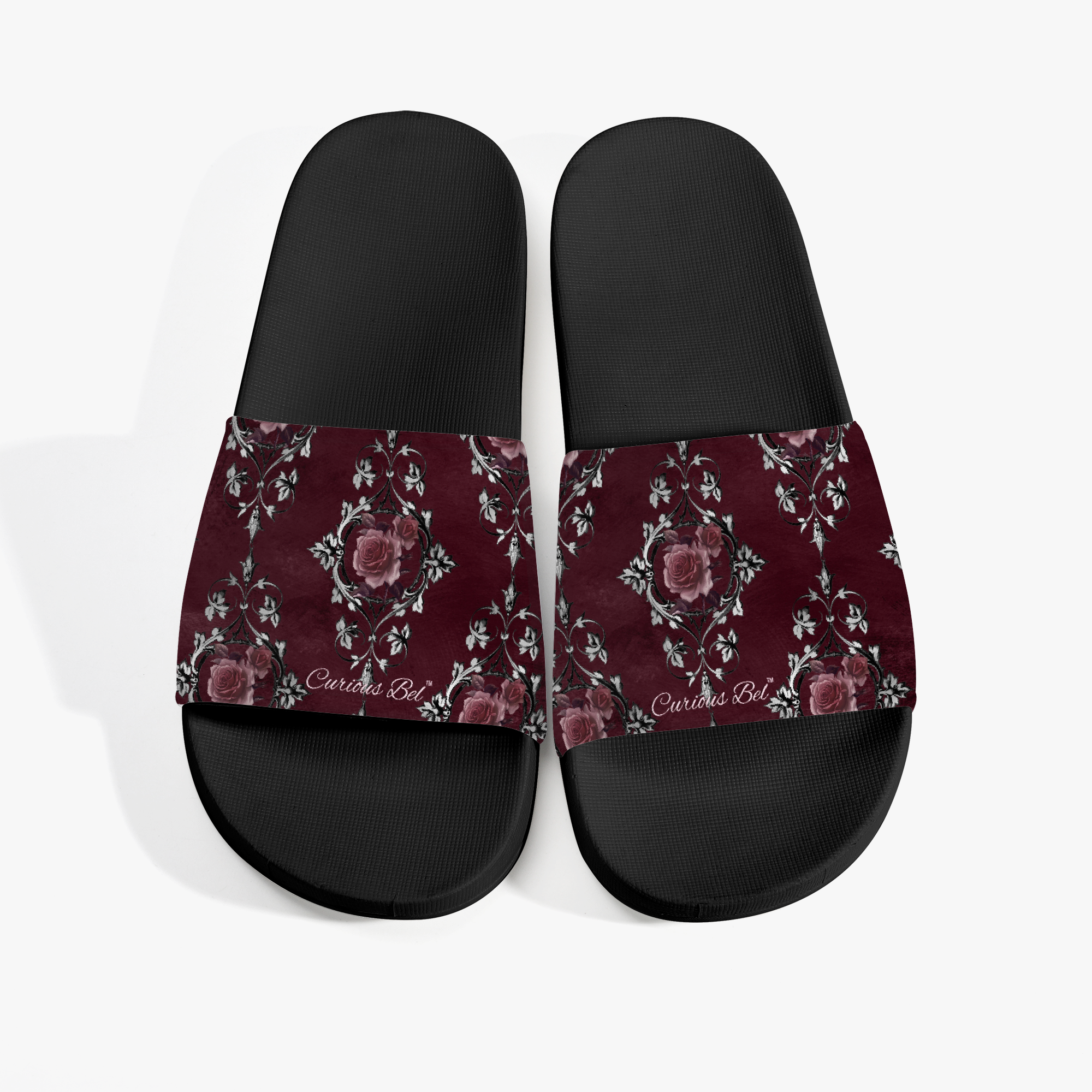 Stressed Burgundy & Rose Collection – Black Slide Sandals Burgundy with Pink Rose Damask