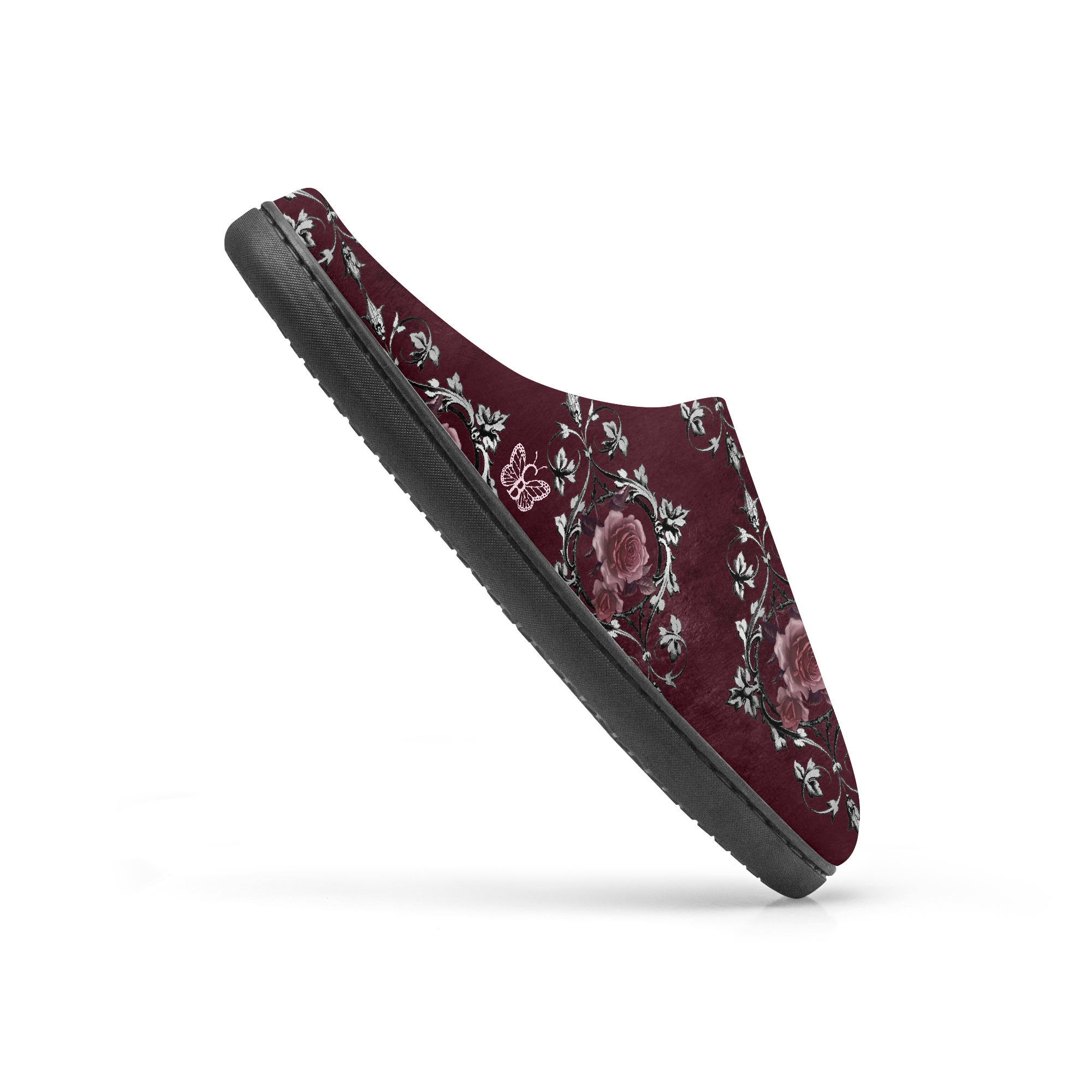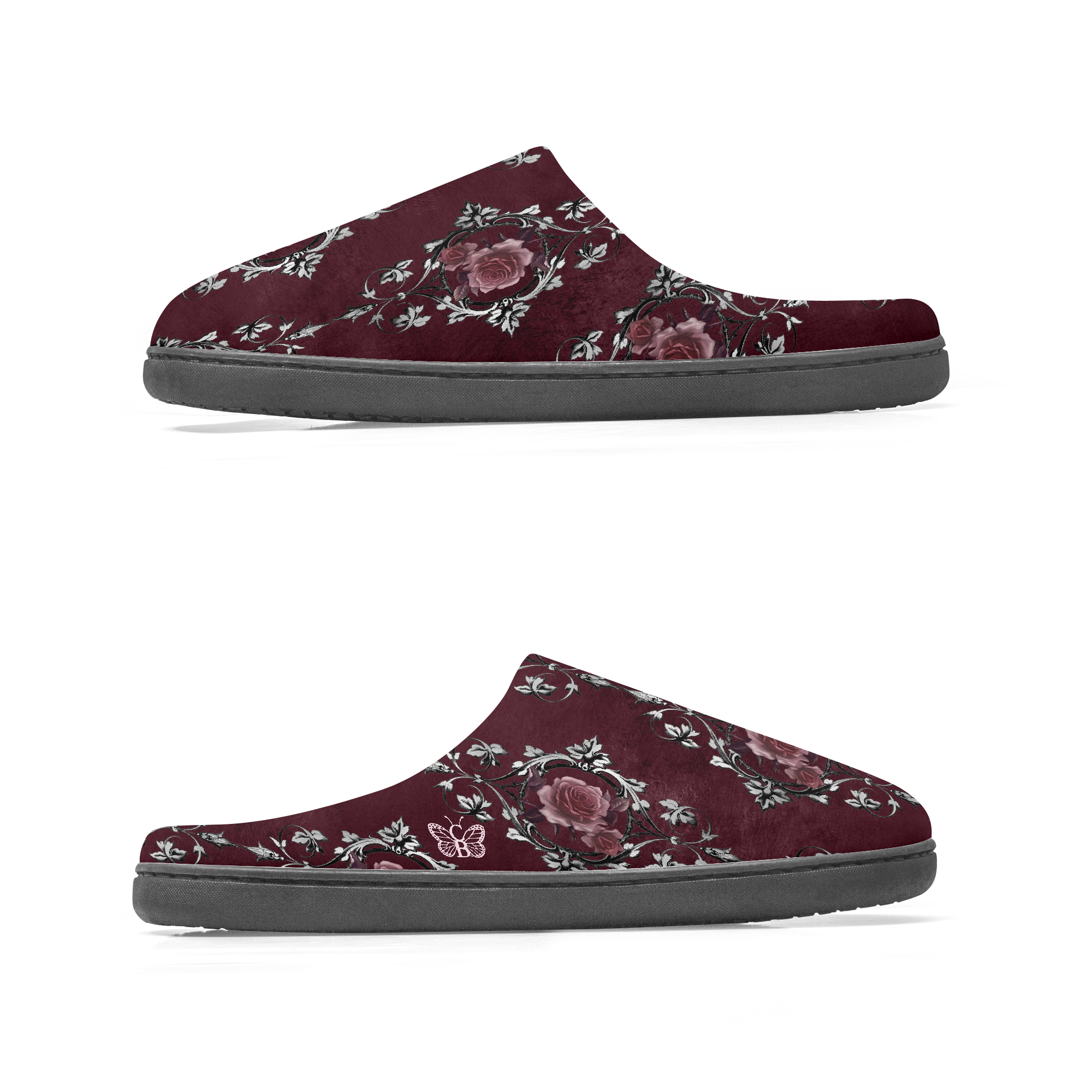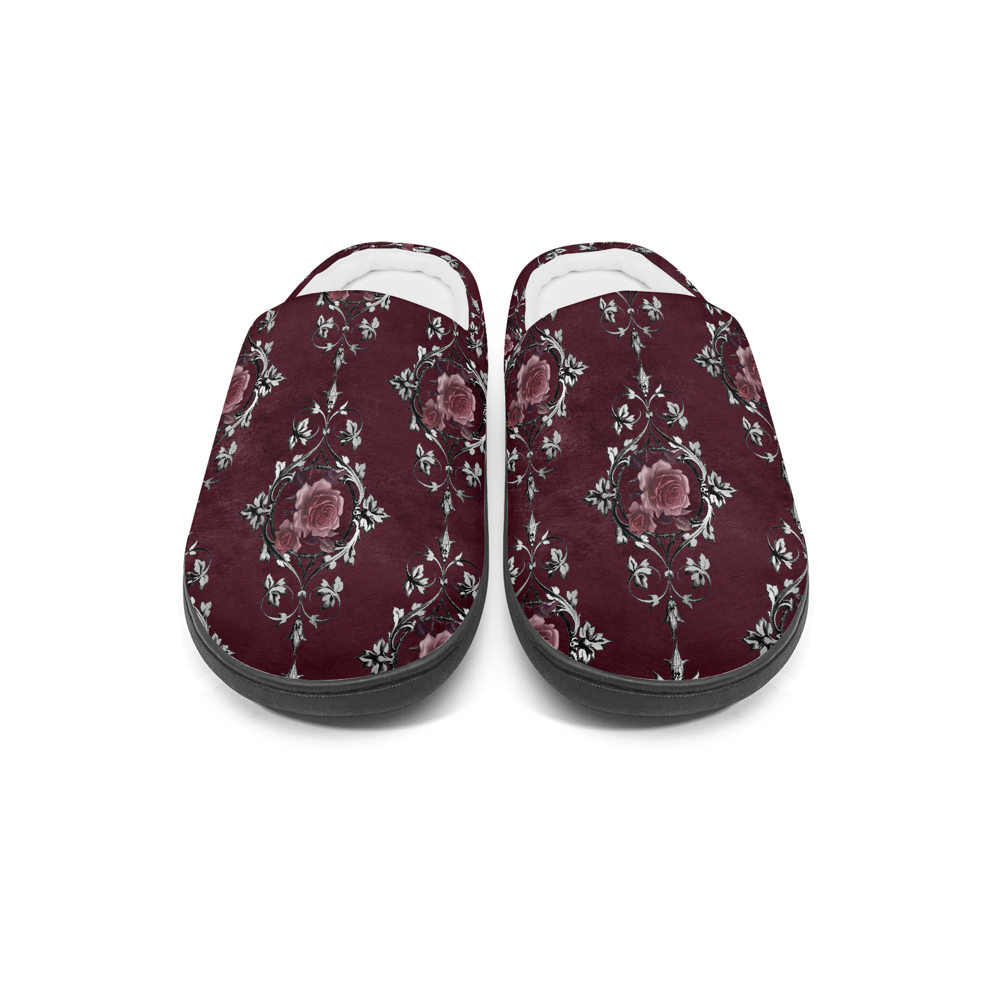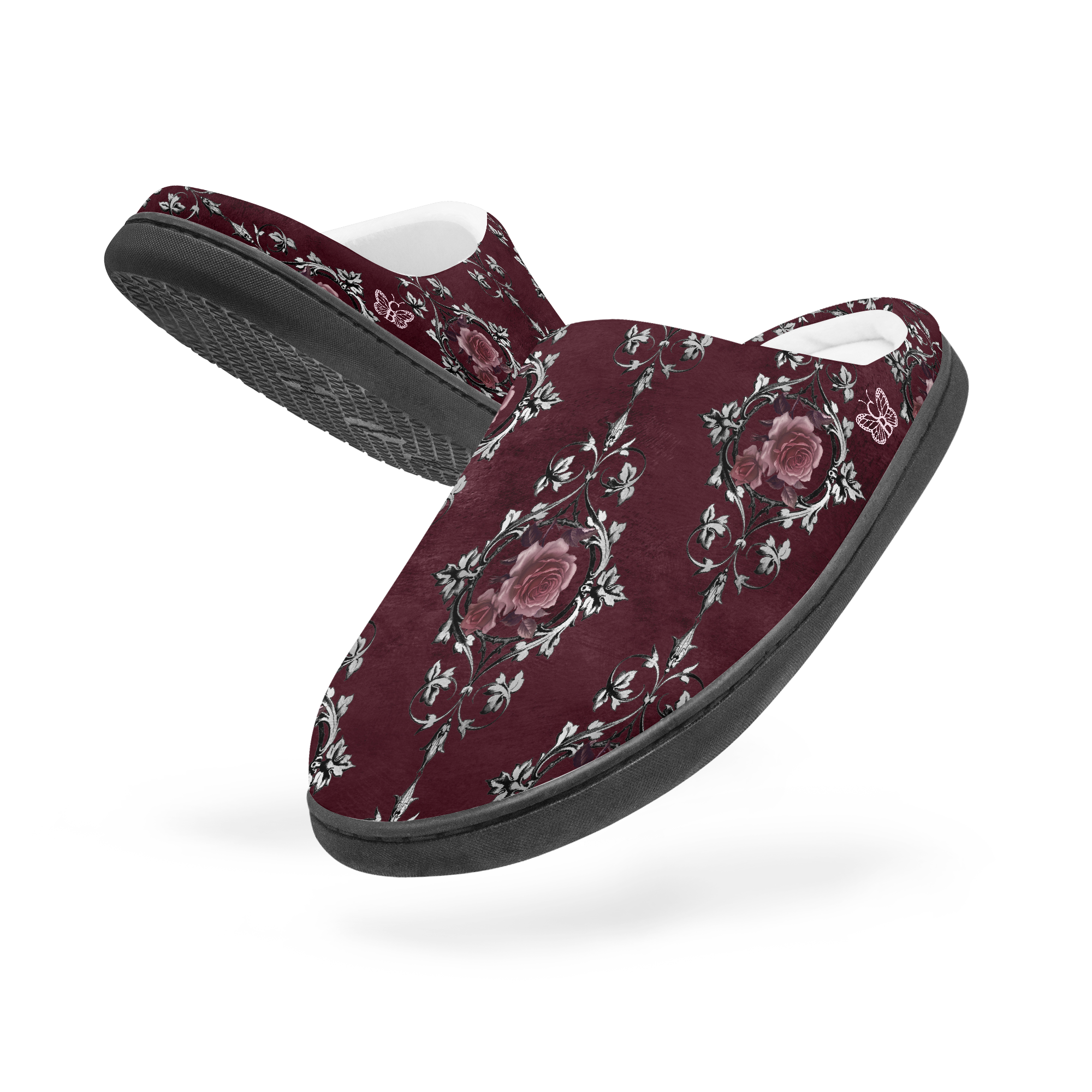 Stressed Burgundy & Rose Collection – Cotton Slippers Burgundy with Pink Rose Damask