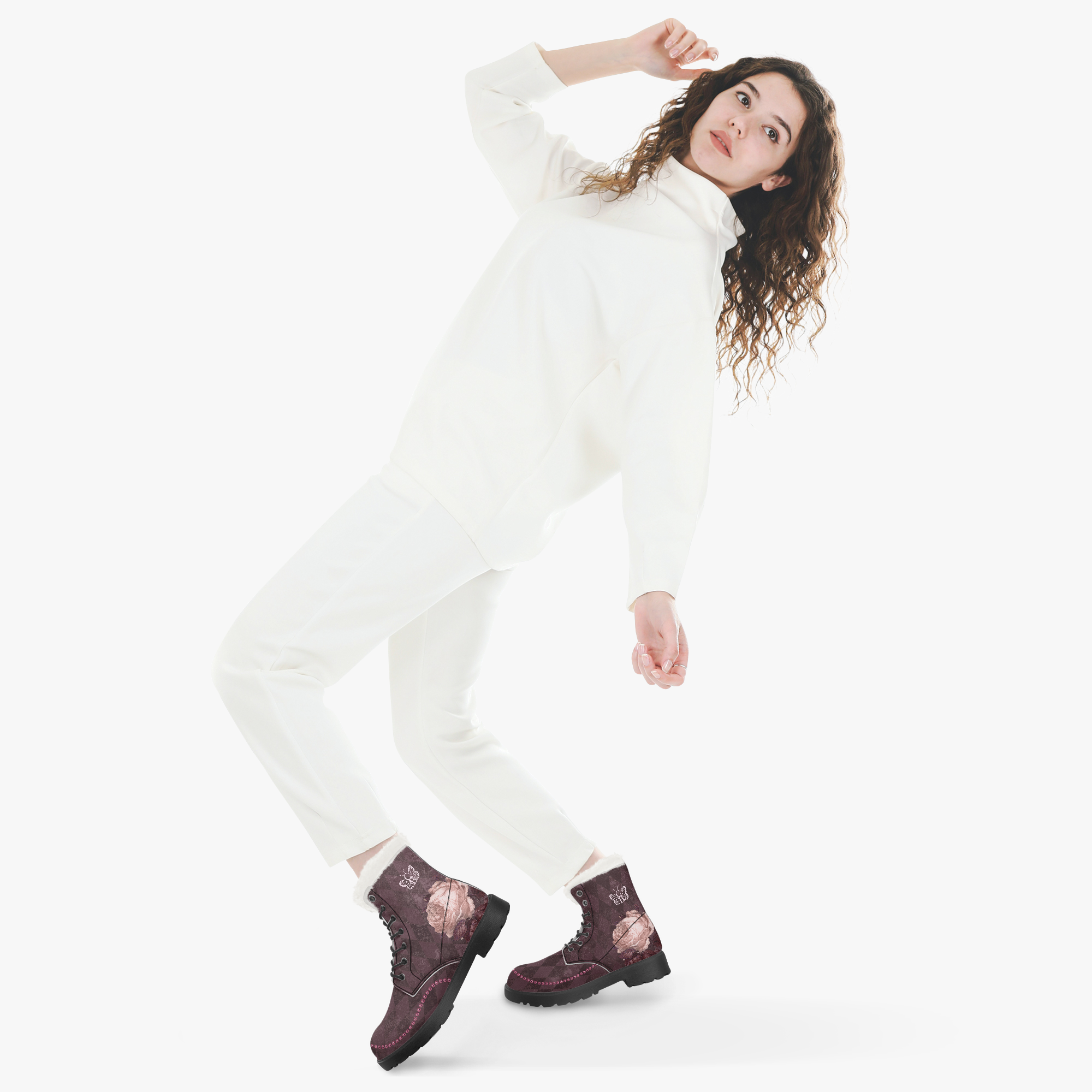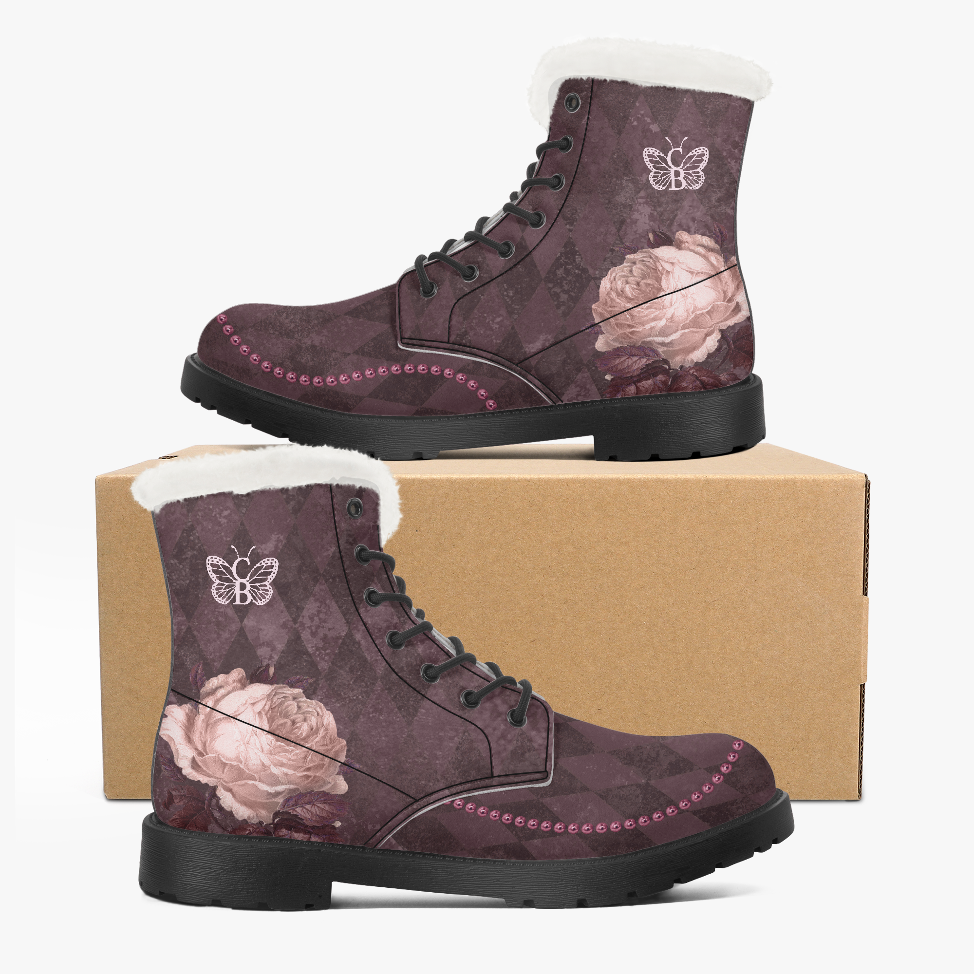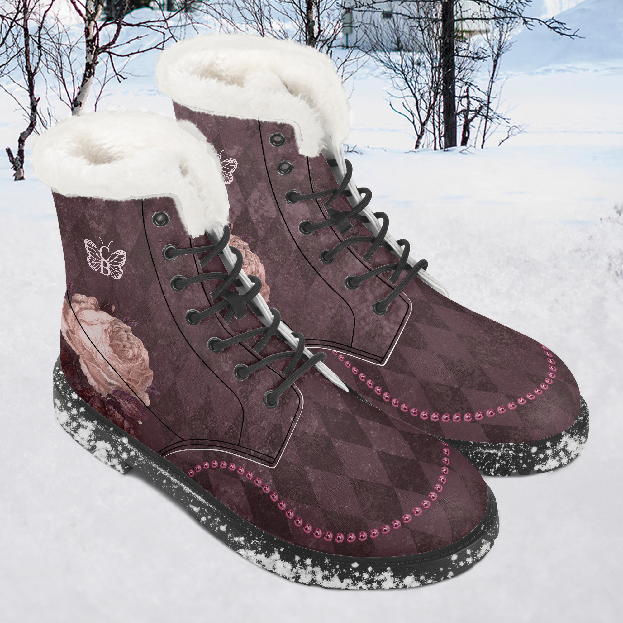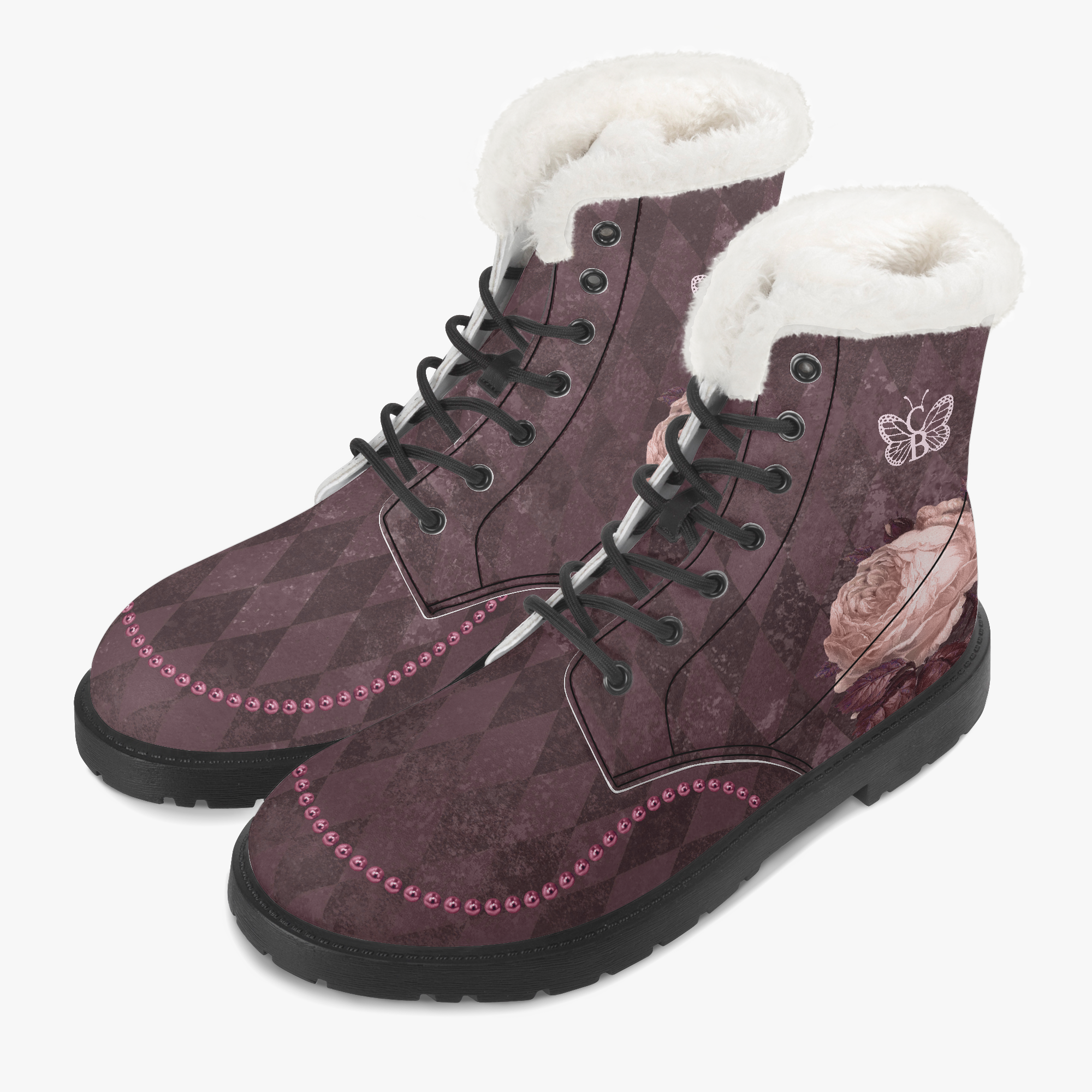 Stressed Burgundy & Rose Collection – Faux Fur Leather Boots Burgundy with Pink Rose