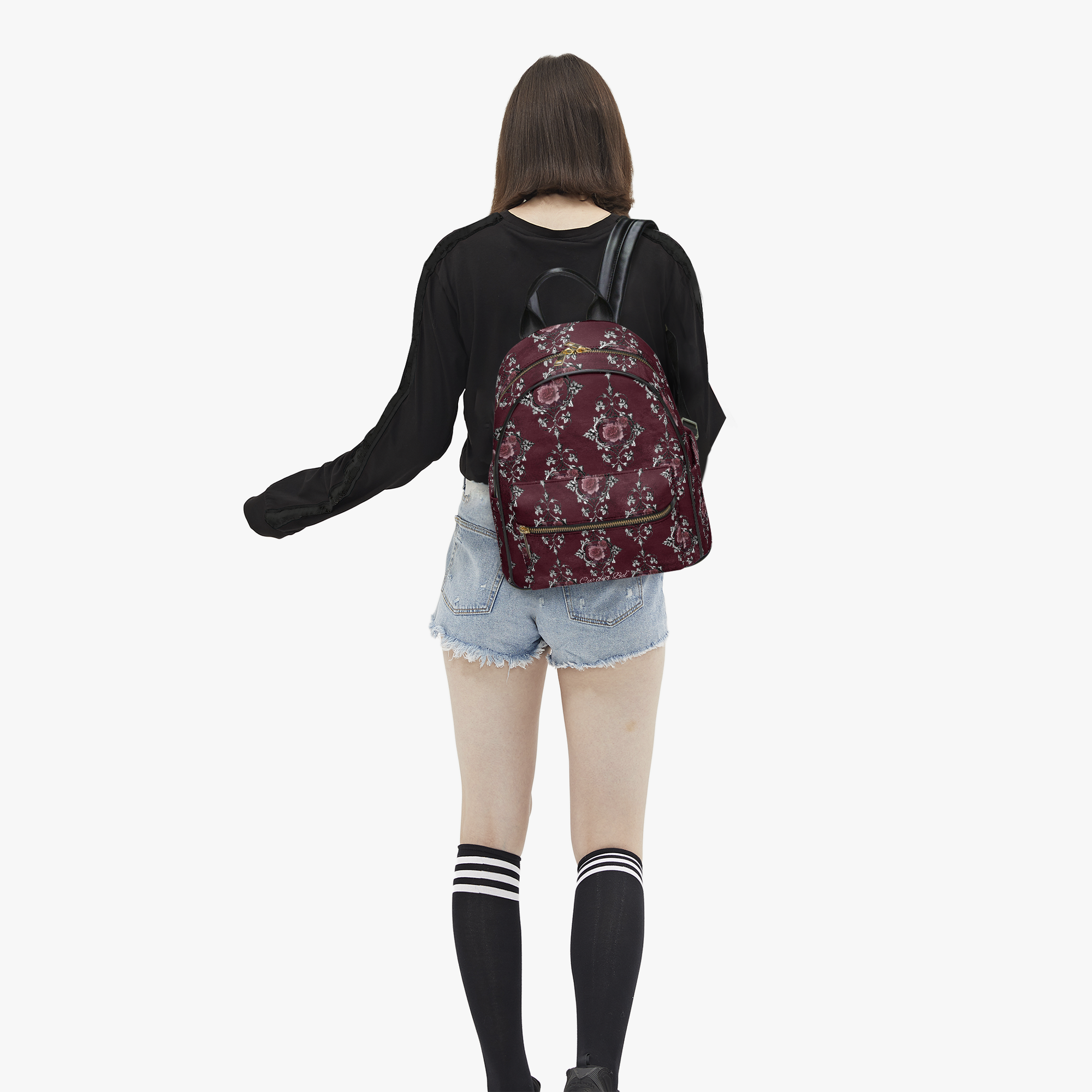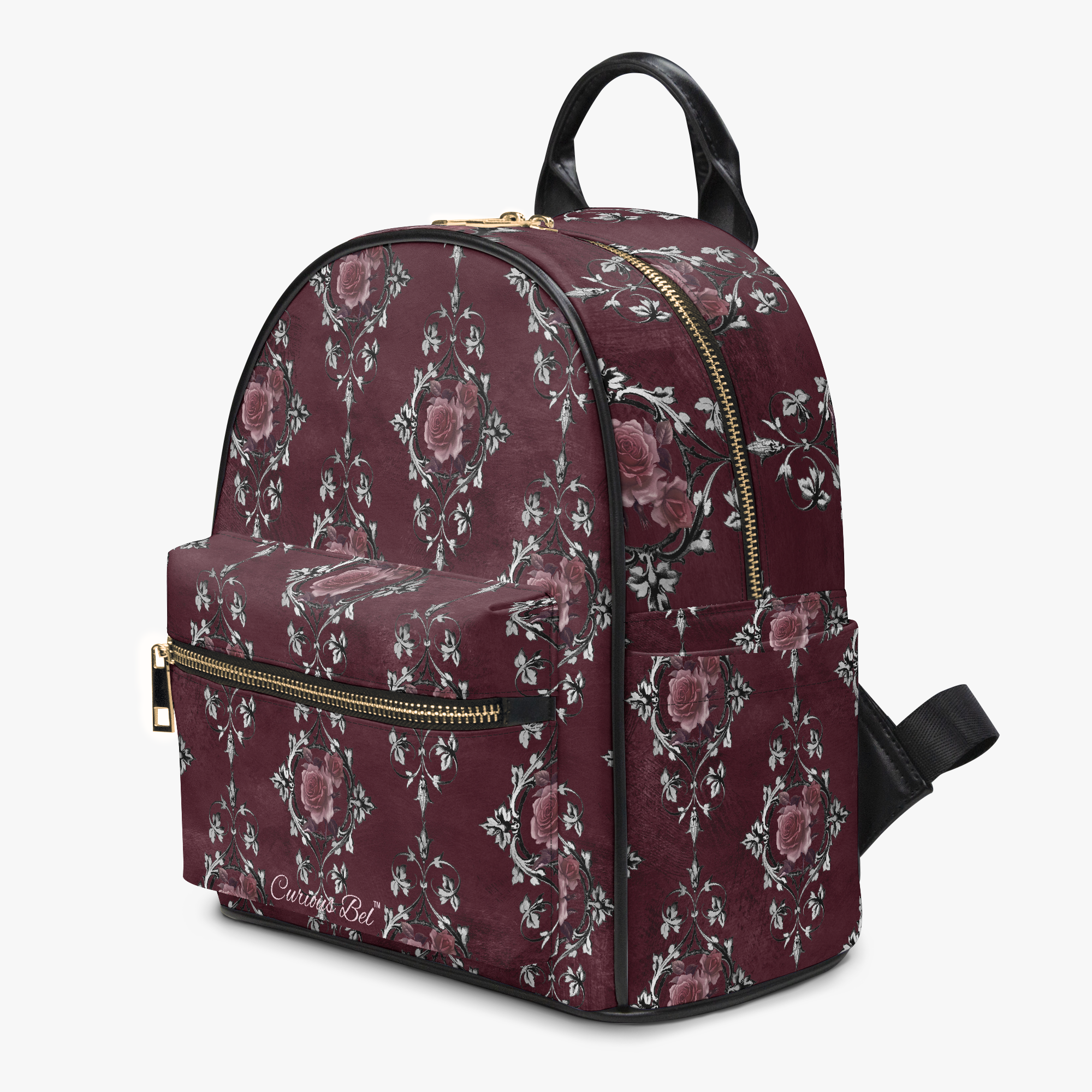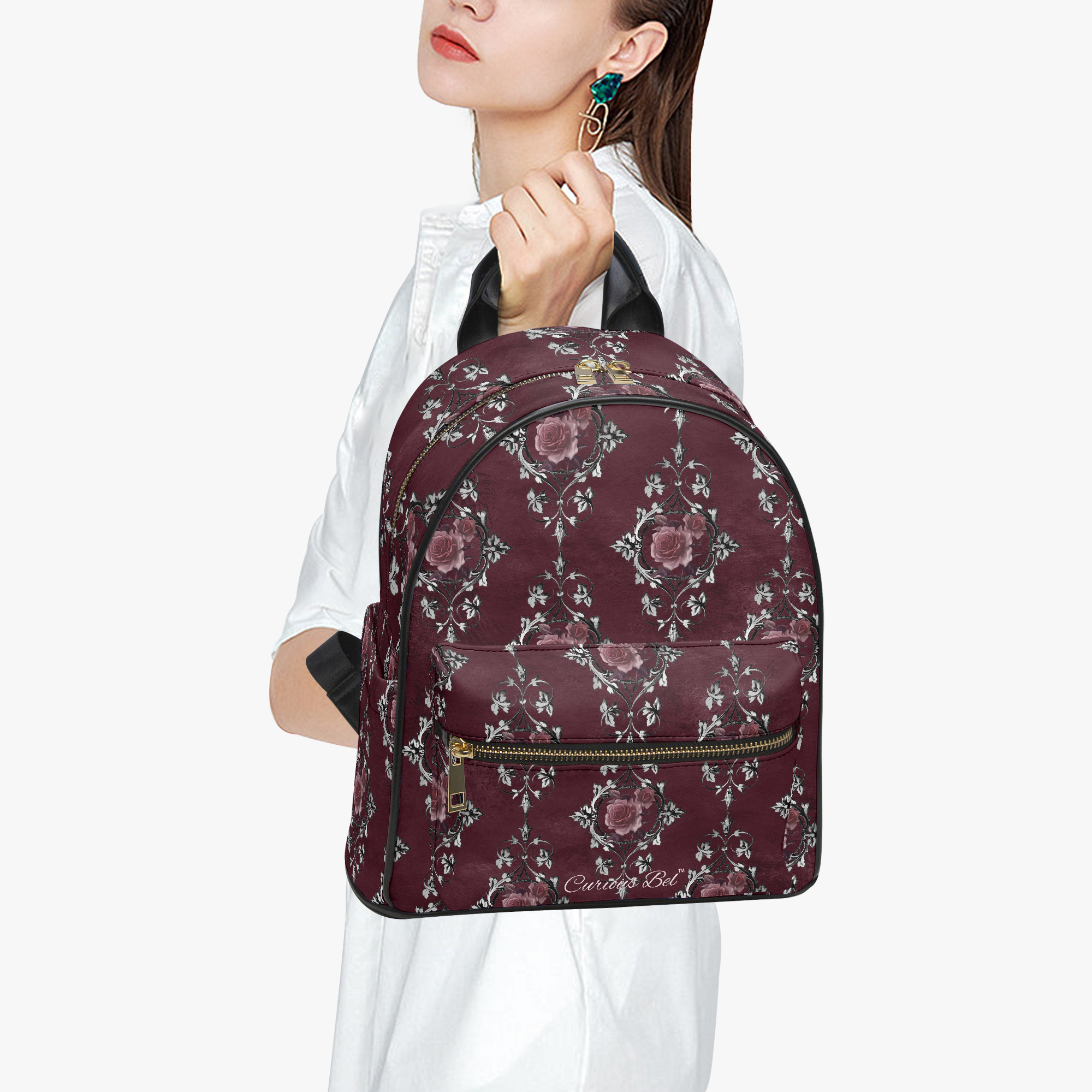 Stressed Burgundy & Rose Collection – Faux Leather Backpack Burgundy with Pink Rose Damask