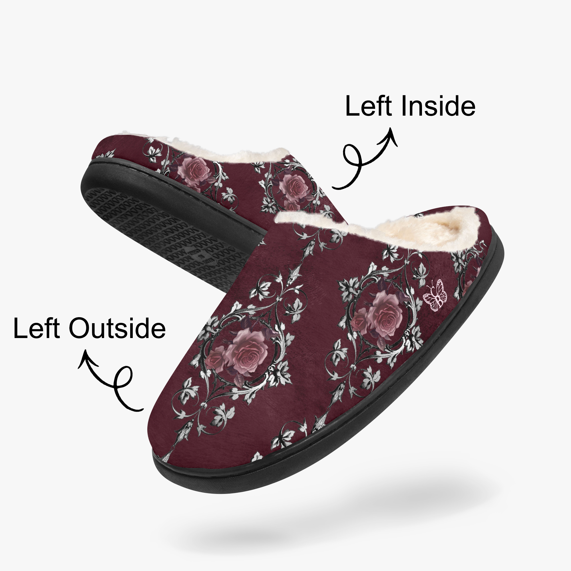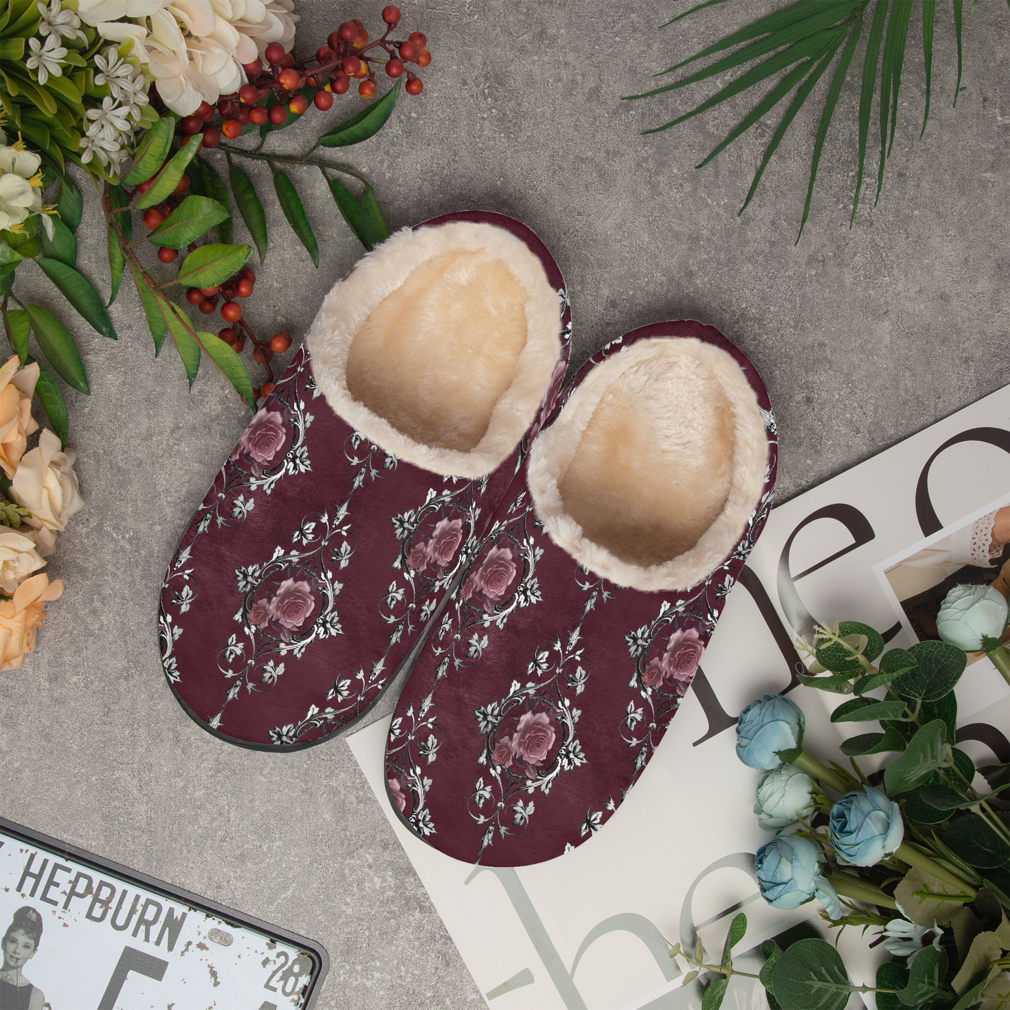 Stressed Burgundy & Rose Collection – Fluffy Bedroom Slippers Burgundy with Pink Rose Damask