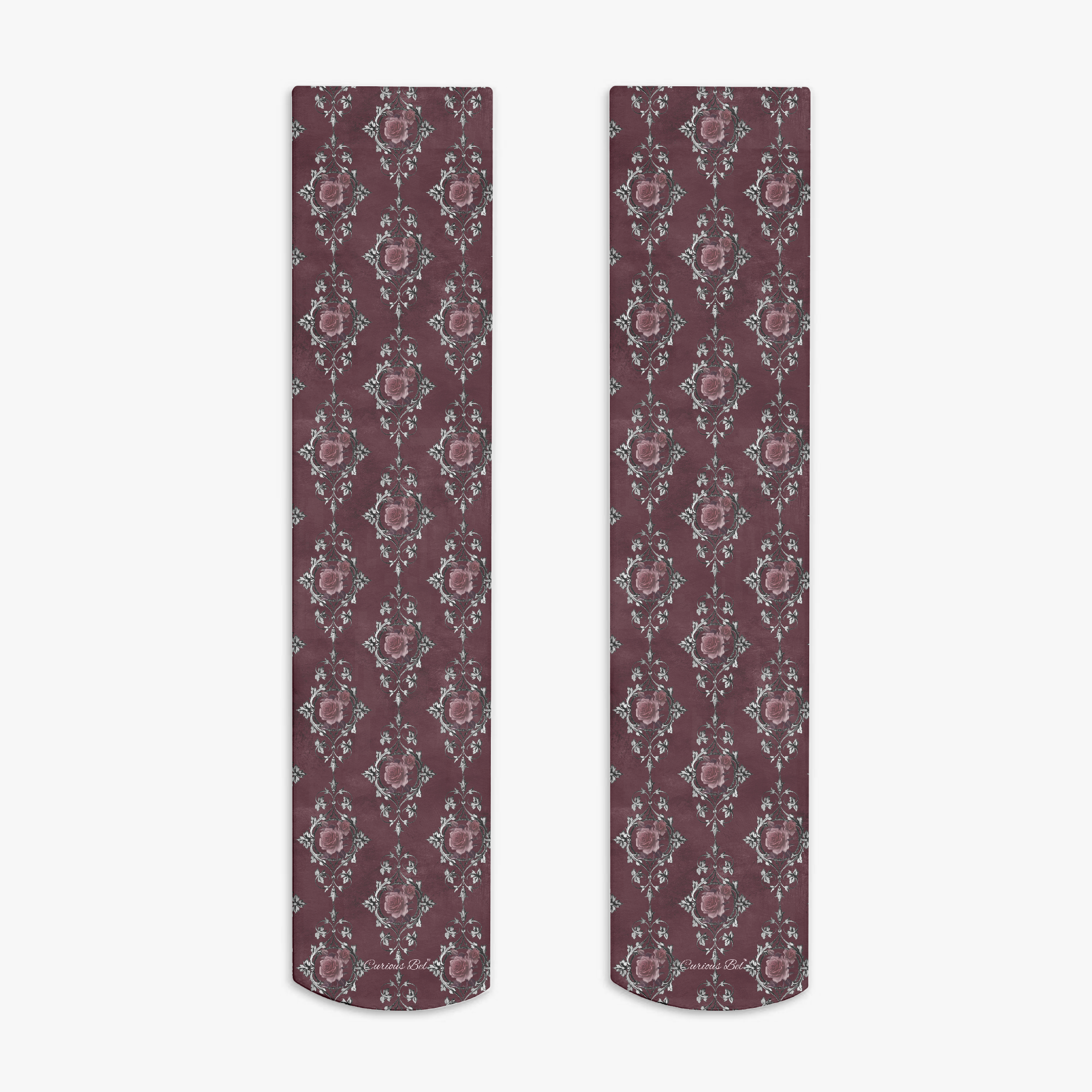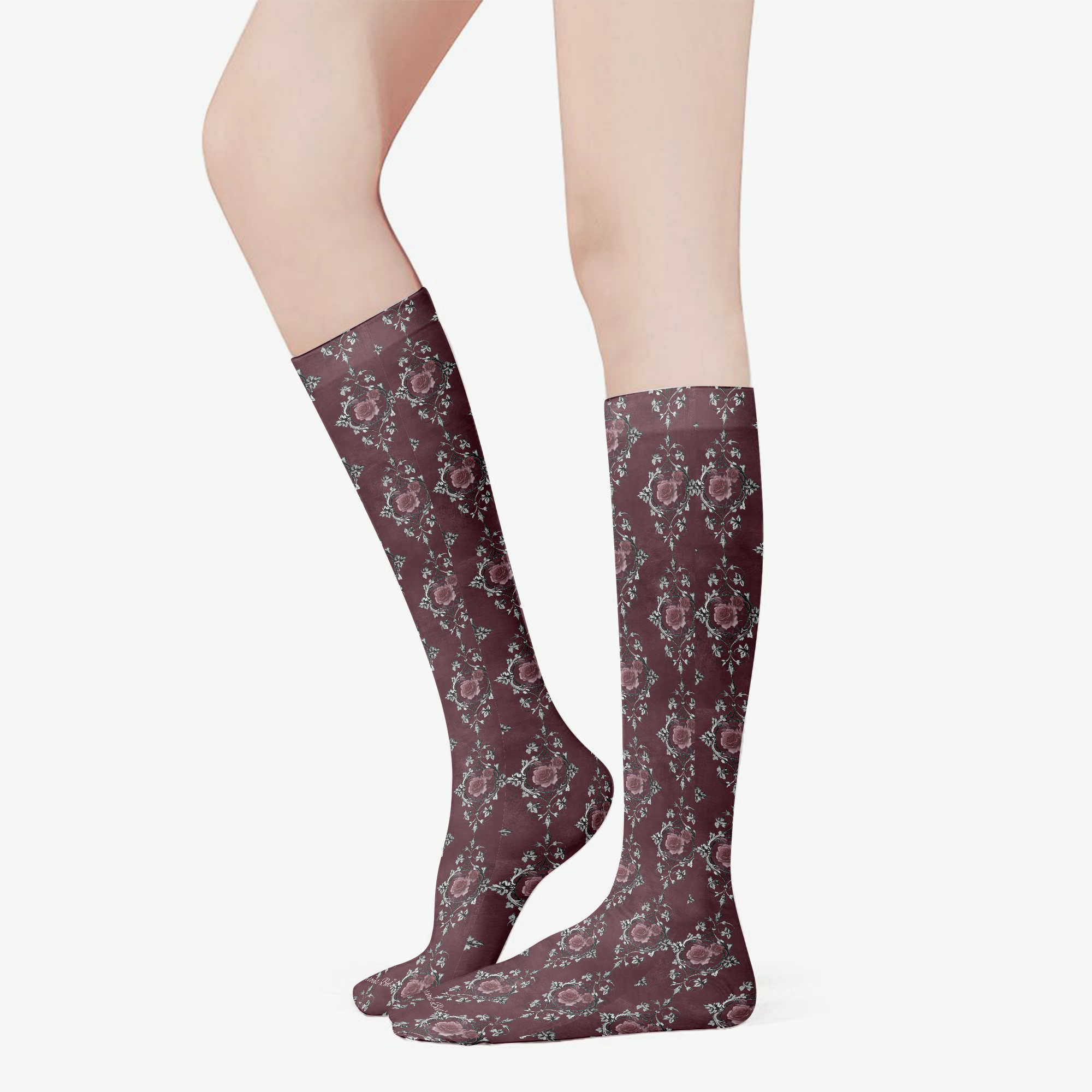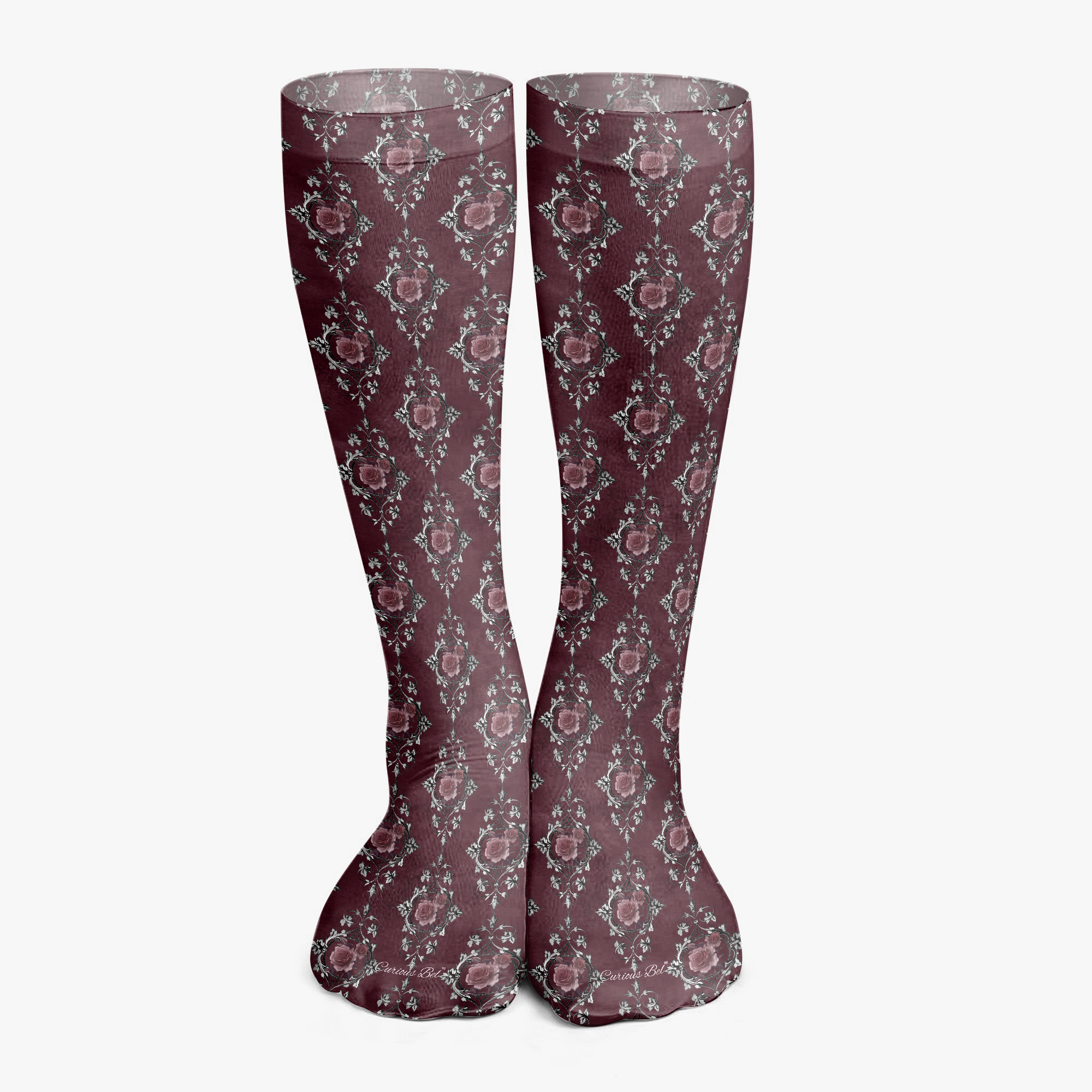 Stressed Burgundy & Rose Collection – Knee High Socks Burgundy with Pink Rose Damask