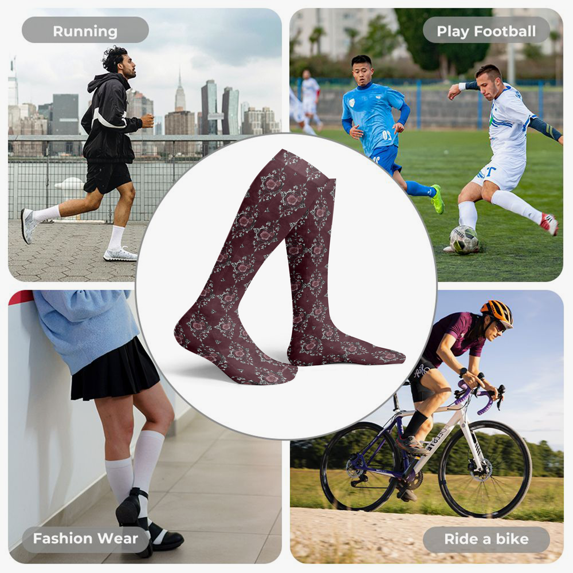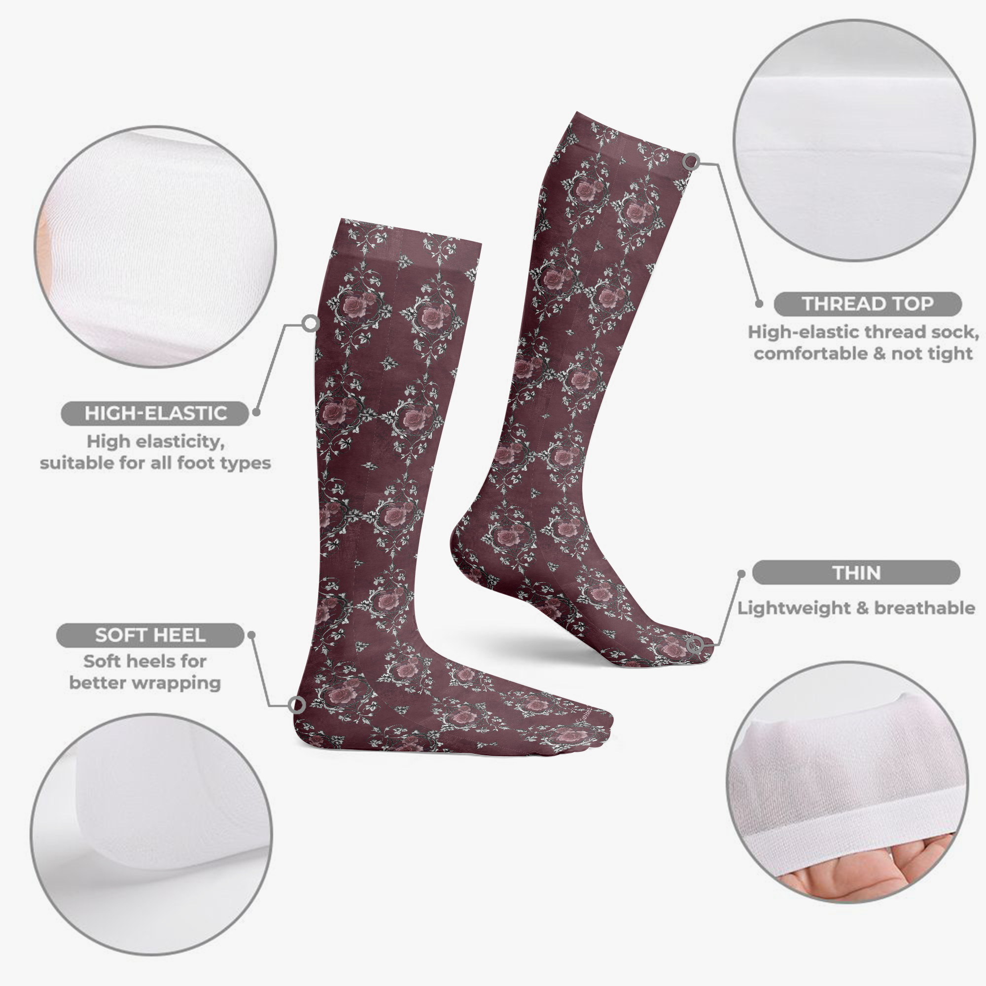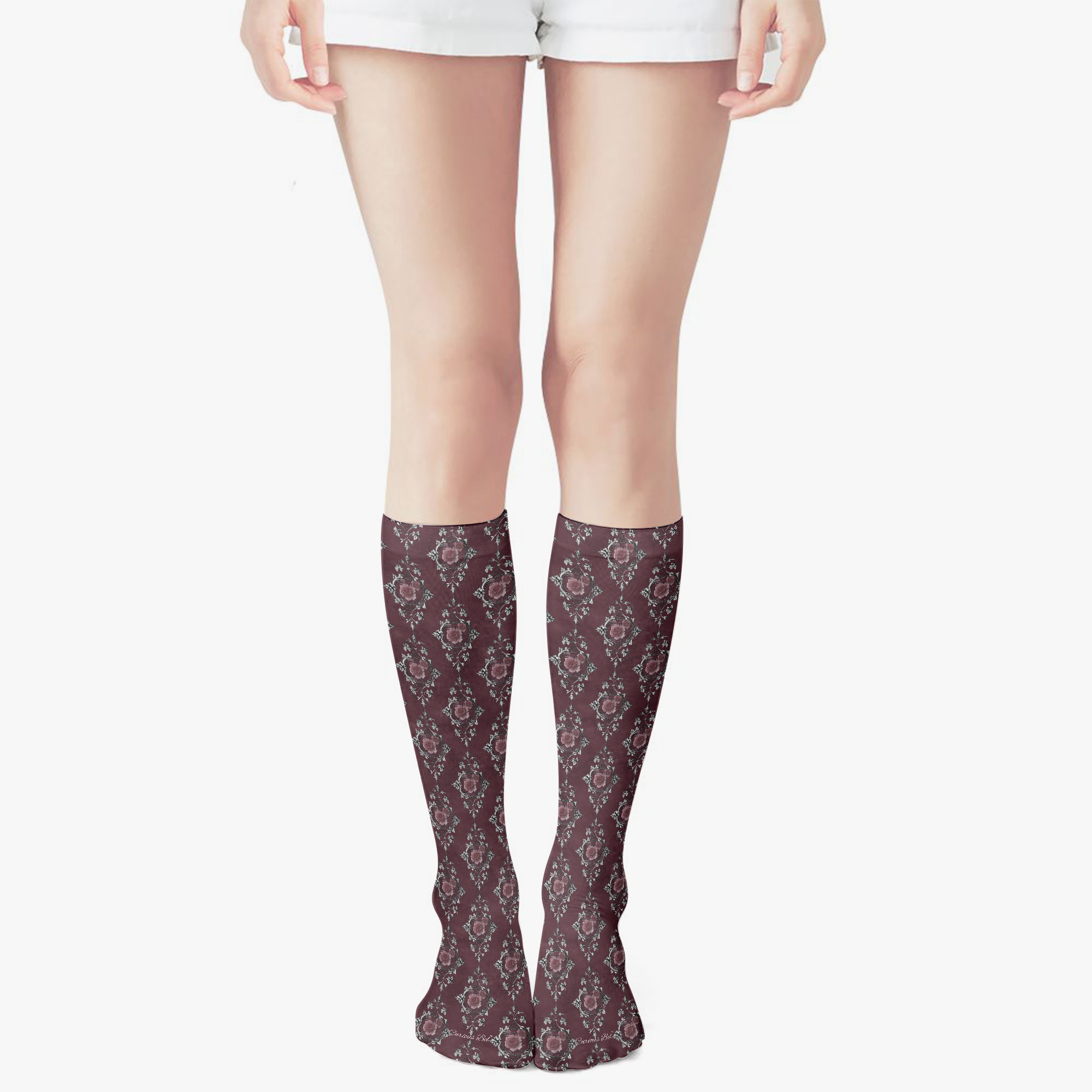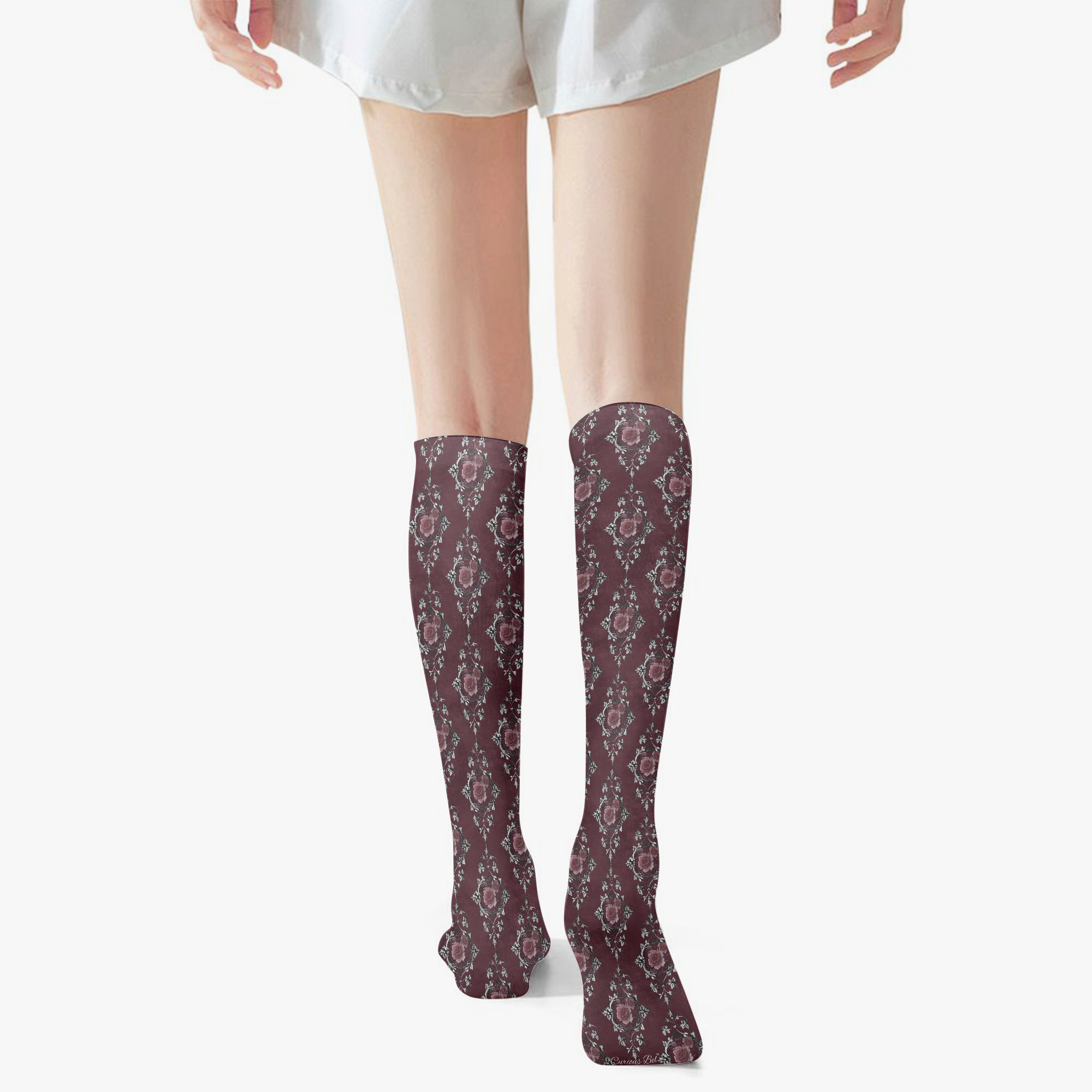 Stressed Burgundy & Rose Collection – Knee High Socks Burgundy with Pink Rose Damask