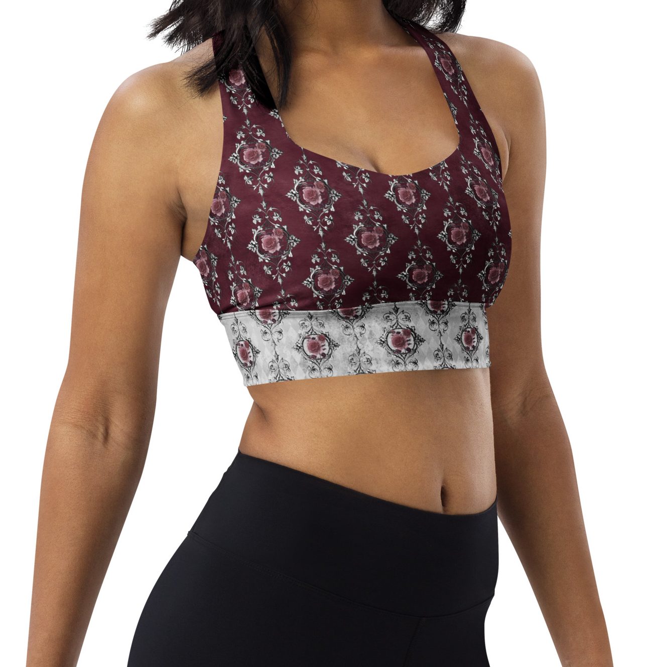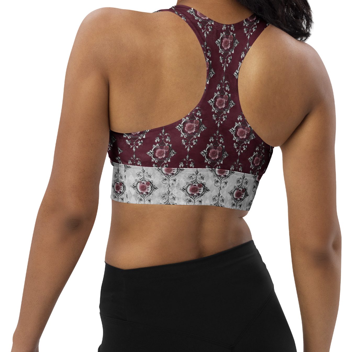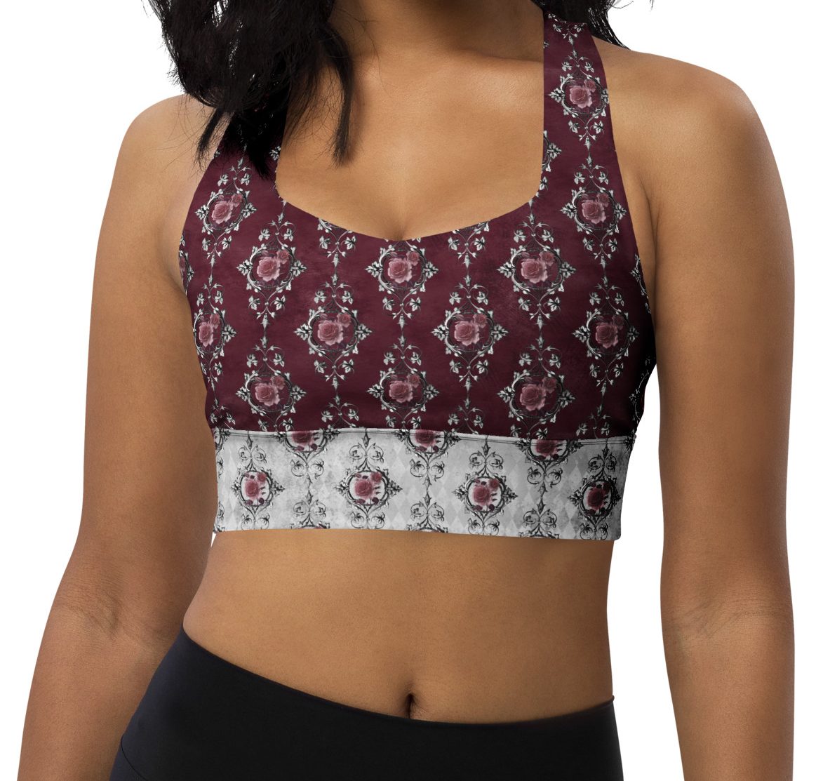 Stressed Burgundy & Rose Collection – Longline Sports Bra Burgundy and Pink Rose Damask